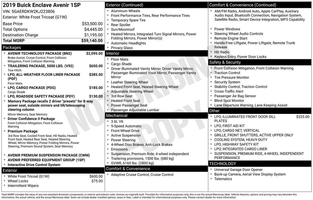 Boyd Chevrolet is proud to offer this White Frost Tricoat, 2019 Enclave Avenir featuring: 5000lbs Trailering Package (Heavy-Duty Cooling System), Avenir Package (120-Volt Power Outlet, 3rd Row 60/40 Power Fold Split-Bench, Automatic Heated Steering Wheel, Front Power Sliding Moonroof, HD Radio, Heated 2nd Row Outboard Seats, Heated Driver & Front Passenger Seats, Outside Heated Power-Adjustable Mirrors, Power Tilt & Telescopic Steering Column, Ventilated Driver & Front Passenger Seats, Wheels & Front Door Badging, and Wireless Charging), Avenir Premium Suspension Package (Chassis Continuously Variable Real Time Damping and Premium Ride Suspension), Avenir Technology Package (Active Upper Only Front Shutter Grille, Advanced Adaptive Cruise Control, and Forward Automatic Braking), Cargo Package (LPO) (Cargo Security Shade (LPO) and Vertical Cargo Net (LPO)), Floor Liner Package (LPO) (1st & 2nd Row All-Weather Floor Liner (LPO), 3rd Row All-Weather Floor Liner (LPO), and Integrated Cargo Liner (LPO)), Memory Package, Preferred Equipment Group 1SP, Roadside Safety Package (LPO) (First Aid Kit (LPO) and Highway Safety Kit), 10 Speakers, 3.49 Axle Ratio, 3rd row seats: split-bench, 4-Wheel Disc Brakes, 7-Passenger Seating, ABS brakes, Air Conditioning, Alloy wheels, AM/FM radio: SiriusXM, Apple CarPlay/Android Auto, Audio memory, Auto High-beam Headlights, Auto tilt-away steering wheel, Auto-dimming door mirrors, Auto-dimming Rear-View mirror, Automatic temperature control, Bose Performance-Enhanced 10-Speaker System, Brake assist, Bumpers: body-color, Compass, Delay-off headlights, Driver door bin, Driver vanity mirror, Dual front impact airbags, Dual front side impact airbags, Electronic Stability Control, Emergency communication system: OnStar and Buick connected services capable, Four wheel independent suspension, Front anti-roll bar, Front Bucket Seats, Front Center Armrest, Front dual zone A/C, Front reading lights, Fully automatic headlights, Garage door transmitter, Heated door mirrors, Heated front seats, Heated rear seats, Heated steering wheel, Illuminated entry, Illuminated Front Door Sill Plates (LPO), Leather steering wheel, Low tire pressure warning, Memory seat, Navigation System, Occupant sensing airbag, Outside temperature display, Overhead airbag, Overhead console, Panic alarm, Passenger door bin, Passenger vanity mirror, Perforated Leather-Appointed Seat Trim, Power door mirrors, Power Driver Lumbar Control Seat Adjuster, Power driver seat, Power Liftgate, Power moonroof, Power Passenger Lumbar Control Seat Adjuster, Power passenger seat, Power steering, Power windows, Premium audio system: Buick Infotainment System, Radio data system, Radio: Buick Infotainment Sys AM/FM Stereo w/Nav, Rear air conditioning, Rear anti-roll bar, Rear reading lights, Rear window defroster, Rear window wiper, Remote keyless entry, Roof rack: rails only, Security system, SiriusXM Radio, Speed control, Speed-sensing steering, Spoiler, Steering wheel memory, Steering wheel mounted audio controls, Tachometer, Telescoping steering wheel, Tilt steering wheel, Traction control, Trip computer, Turn signal indicator mirrors, Variably intermittent wipers, Ventilated front seats, Voltmeter, Wheel Locks, and Wheels: 20 Aluminum w/Premium Pearl Nickel Finish.