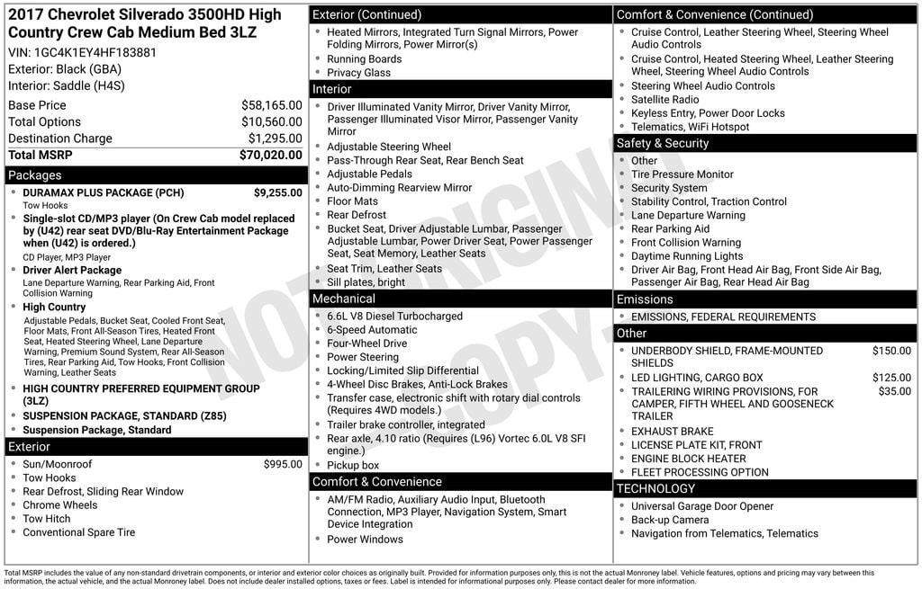 America's Truck year after year! Don't forget we are a KBB Buying Center so we'll buy your car even if you don't buy ours! Boyd is proud to offer this Black, 2017 Silverado 3500HD High Country featuring: Allison 1000 6-Speed Automatic, 4WD, Saddle Leather.Odometer is 17973 miles below market average!Awards:* 2017 KBB.com 10 Most Awarded BrandsCheck out all these great options Driver Alert Package (Forward Collision Alert and Lane Departure Warning System), Duramax Plus Package (Chrome Recovery Hooks and Engine Block Heater), Preferred Equipment Group 3LZ (110-Volt AC Power Outlet, 150 Amps Alternator, 4.2 Diagonal Color Display Driver Info Center, 6 Rectangular Chromed Assist Steps (LPO), Auto-Dimming Inside Rear-View Mirror, Bright Sill Plates, Chrome Bodyside Moldings, Chrome Door Handles, Chrome Power-Adjustable Heated Outside Mirrors, Color-Keyed Carpeting Floor Covering, Deep-Tinted Glass, Digital Steering Assist, Driver & Front Passenger Visors, Dual-Zone Automatic Climate Control, Electric Rear-Window Defogger, Electronic Shift Transfer Case, EZ-Lift & Lower Tailgate, Front Halogen Fog Lamps, Leather-Wrapped Steering Wheel, Manual Tilt-Wheel/Telescoping Steering Column, OnStar Guidance Plan For 3 Months, OnStar w/4G LTE, Power Sliding Rear Window w/Defogger, Power Windows, Rear 60/40 Folding Bench Seat (Folds Up), Rear Vision Camera, Rear Wheelhouse Liners, Remote Keyless Entry, Remote Locking Tailgate, Remote Vehicle Starter System, Single-Slot CD/MP3 Player, SiriusXM Satellite Radio, Spray-On Pickup Box Bed Liner w/Bowtie Logo, Steering Wheel Audio Controls, Unauthorized Entry Theft-Deterrent System, Universal Home Remote, and Wireless Charging), Standard Suspension Package, Trailering Equipment, Allison 1000 6-Speed Automatic, 4WD, Saddle Leather, 18 Chromed Aluminum Wheels, 4 Movable Upper Cargo Tie Downs, 4-Wheel Disc Brakes, 7 Speakers, ABS brakes, Adjustable pedals, Air Conditioning, Alloy wheels, AM/FM radio, Auto-dimming Rear-View mirror, Automatic temperature control, Body-Color Front Bumper, Body-Color Rear Bumper, Bodyside moldings, Bose 7 Speaker Sound System, Brake assist, Bumpers: body-color, Carpeted Front & Rear Floor Mats, CD player, Chrome wheels, Compass, Delay-off headlights, Driver door bin, Driver vanity mirror, Dual front impact airbags, Dual front side impact airbags, Electronic Stability Control, Emergency communication system: OnStar Guidance, Exhaust Brake, Exterior Parking Camera Rear, Floor Mounted Console, Front anti-roll bar, Front Bucket Seats, Front Center Armrest, Front dual zone A/C, Front fog lights, Front Frame-Mounted Black Recovery Hooks, Front Full Feature Bucket Seats, Front License Plate Kit, Front reading lights, Front wheel independent suspension, Fully automatic headlights, Garage door transmitter, HD Radio, Heated & Vented Front Seating, Heated door mirrors, Heated front seats, Heated steering wheel, Illuminated entry, Leather Wrapped Heated Steering Wheel, LED Cargo Box Lighting, Low tire pressure warning, Memory seat, Navigation System, Occupant sensing airbag, Outside temperature display, Overhead airbag, Overhead console, Panic alarm, Passenger door bin, Passenger vanity mirror, Pedal memory, Perforated Leather-Appointed Seat Trim, Power Adjustable Pedals, Power door mirrors, Power driver seat, Power passenger seat, Power steering, Power Sunroof, Power windows, Premium audio system: Chevrolet MyLink, Radio: Chevrolet MyLink w/Navigation, Rear reading lights, Rear seat center armrest, Rear step bumper, Rear window defroster, Remote keyless entry, Security system, Speed control, Speed-sensing steering, Split folding rear seat, Steering wheel mounted audio controls, Tachometer, Telescoping steering wheel, Tilt steering wheel, Traction control, Trip computer, Turn signal indicator mirrors, Ultrasonic Front & Rear Park Assist, Variably intermittent wipers, Ventilated front seats, and Voltmeter Located at 1875 Spartanburg Hwy, Hendersonvil