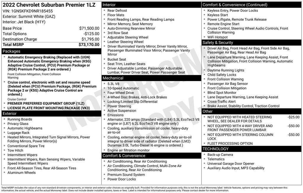 Boyd Chevrolet is proud to offer this Summit White, 2022 Suburban Premier featuring: License Plate Front Mounting Package, Preferred Equipment Group 1LZ (1st & 2nd Row Color-Keyed Carpeted Floor Mats, 2-Speed Active Electronic AutoTrac Transfer Case, 3rd Row 60/40 Power-Folding Split-Bench, Auto-Dimming Inside Rear-View Mirror, Automatic Stop/Start, Bose 10-Speaker Surround w/CenterPoint, Bright Front & Rear Door Sill Plates, Chrome Door Handles w/Body-Color Strip, Chrome Mirror Caps, Color-Keyed Carpeting Floor Covering, Driver & Front Outboard Passenger Airbags, Dual Exhaust System, Enhanced Driver Information Center, Floor Console, Front & Rear Park Assist, Hands-Free Rear Power Programmable Liftgate, Heated & Ventilated Driver & Front Passenger Seats, Heated 2nd Row Outboard Seats, Heated Driver & Front Passenger Seats, Heated Steering Wheel, Hill Descent Control, Infotainment Display, Lane Change Alert w/Side Blind Zone Alert, Leather-Wrapped Steering Wheel, LED Daytime Running Lamps, Memory Settings, Outside Heated Power-Adjustable Mirrors, Power Release 2nd Row Bucket Seats, Power Tilt & Telescopic Steering Column, Rear Cross Traffic Alert, Remote Start, Safety Alert Seat, SiriusXM Radio w/360L, Start/Stop System Disable Button, Universal Home Remote, and Wireless Charging), 10 Speakers, 20 x 9 Polished Aluminum Wheels, 3.23 Rear Axle Ratio, 3rd row seats: split-bench, 4-Wheel Disc Brakes, ABS brakes, Adaptive suspension, Air Conditioning, Alloy wheels, AM/FM radio: SiriusXM with 360L, Apple CarPlay/Android Auto, Auto High-beam Headlights, Auto-dimming door mirrors, Auto-dimming Rear-View mirror, Auto-leveling suspension, Automatic temperature control, Brake assist, Bumpers: body-color, Compass, Delay-off headlights, Driver door bin, Driver vanity mirror, Dual front impact airbags, Dual front side impact airbags, Electronic Stability Control, Emergency communication system: OnStar and Chevrolet connected services capable, Four wheel independent suspension, Front anti-roll bar, Front Bucket Seats, Front Center Armrest, Front dual zone A/C, Front reading lights, Fully automatic headlights, Garage door transmitter, Heated door mirrors, Heated front seats, Heated rear seats, Heated steering wheel, Illuminated entry, Leather steering wheel, Low tire pressure warning, Magnetic Ride Control Suspension, Memory seat, Navigation System, Not Equipped w/4-Way Driver & Fr Pass Pwr Lumbar, Not Equipped w/Heated Steering Wheel (DISC), Not Equipped w/Steering Column Lock, Occupant sensing airbag, Outside temperature display, Overhead airbag, Overhead console, Panic alarm, Passenger door bin, Passenger vanity mirror, Perforated Leather Seating Surfaces, Power door mirrors, Power driver seat, Power Liftgate, Power passenger seat, Power steering, Power windows, Premium audio system: Chevrolet Infotainment 3 Premium, Radio: Chevrolet Infotainment 3 Premium System, Rain sensing wipers, Rear air conditioning, Rear anti-roll bar, Rear reading lights, Rear window defroster, Rear window wiper, Remote keyless entry, Roof rack: rails only, Security system, Speed control, Speed-sensing steering, Split folding rear seat, Spoiler, Steering wheel memory, Steering wheel mounted audio controls, Tachometer, Telescoping steering wheel, Tilt steering wheel, Traction control, Trip computer, Turn signal indicator mirrors, Variably intermittent wipers, Ventilated front seats, and Voltmeter.Odometer is 8653 miles below market average!14/19 City/Highway MPGCheck out all these great options License Plate Front Mounting Package, Preferred Equipment Group 1LZ (1st & 2nd Row Color-Keyed Carpeted Floor Mats, 2-Speed Active Electronic AutoTrac Transfer Case, 3rd Row 60/40 Power-Folding Split-Bench, Auto-Dimming Inside Rear-View Mirror, Automatic Stop/Start, Bose 10-Speaker Surround w/CenterPoint, Bright Front & Rear Door Sill Plates, Chrome Door Handles w/Body-Color Strip, Chrome Mirror Caps, Color-Keyed Carpeting Floor Covering, Driver & F
