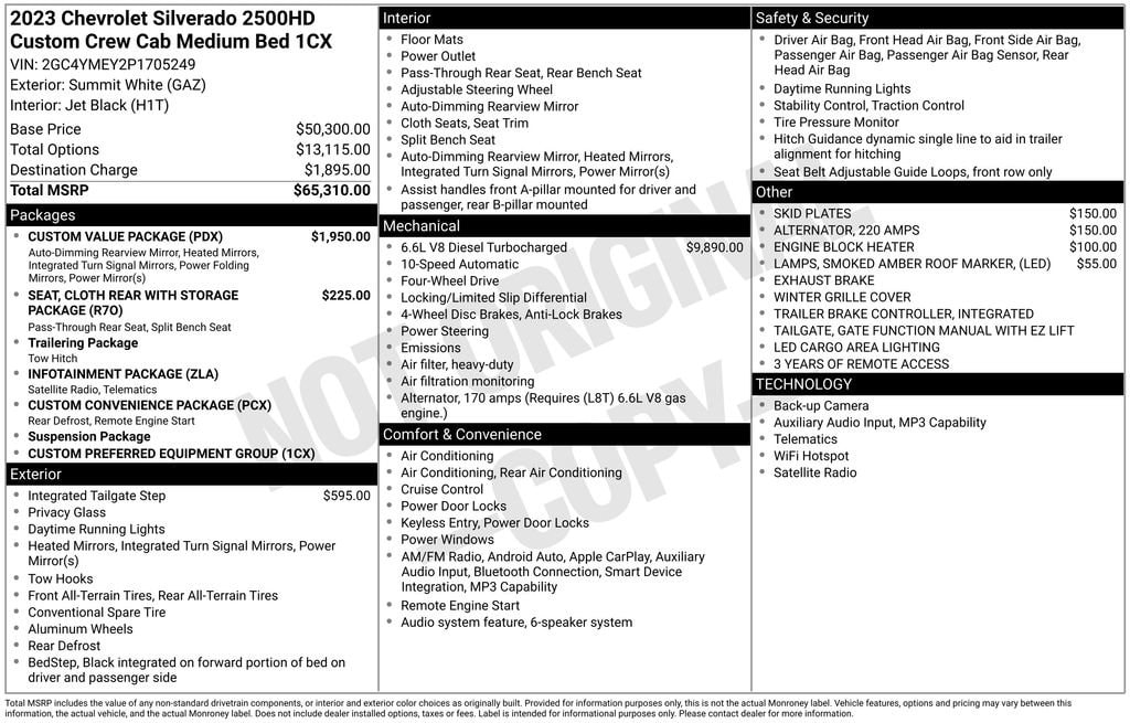 This 2023 Silverado 2500HD Custom at Boyd Chevrolet comes with lifetime powertrain coverage at no additional cost. Warranty Forever covers the engine, transmission and drive axel for the life of the vehicle with no limit on time or miles. Warranty Forever is exclusively at Boyd so come see us today! Boyd Chevy is proud to offer this Summit White, 2023 Silverado 2500HD Custom featuring: Check out all these great options Cloth Rear Seat w/Storage Package, Custom Convenience Package (Electric Rear-Window Defogger, EZ Lift Power Lock & Release Tailgate, Integrated Trailer Brake Controller, LED Cargo Area Lighting, and Remote Vehicle Starter System), Custom Value Package (Auto-Dimming Inside Rear-View Mirror and Power-Adjustable Vertical Trailering Mirrors), Infotainment Package (Chevrolet Connected Access Capable, Compass, OnStar & Chevrolet Connected Services Capable, SiriusXM Radio, and Wi-Fi Hotspot Capable), Preferred Equipment Group 1CX (170 Amp Alternator, 2-Speed Electronic Shift Transfer Case, 3.5 Diagonal Monochromatic Display DIC, Black Mirror Caps, Bluetooth® For Phone, Body Color Front Grille, Color-Keyed Carpeting Floor Covering, Deep-Tinted Glass, Electronic Cruise Control w/Set & Resume Speed, Front Rubberized Vinyl Floor Mats, Heated Vertical Trailering Mirrors, Locking Tailgate, Manual Tailgate Function w/No EZ Lift, Manual Tilt-Wheel Steering Column, Power Door Locks, Power Front Windows w/Driver Express Up/Down, Power Front Windows w/Passenger Express Down, Power Rear Windows w/Express Down, Rear 60/40 Folding Bench Seat (Folds Up), Rear Rubberized Vinyl Floor Mats, Remote Keyless Entry, and Standard Tailgate), Suspension Package, 10-Speed Automatic, 4WD, Black Cloth, 220 Amp Alternator, 3 Years of Remote Access, 4-Wheel Disc Brakes, 6 Speakers, 6-Speaker Audio System, 720 Cold-Cranking Amps Heavy-Duty Battery, ABS brakes, Air Conditioning, Alloy wheels, AM/FM radio, Apple CarPlay/Android Auto, Brake assist, Cloth Seat Trim, Delay-off headlights, Driver door bin, Dual front impact airbags, Dual front side impact airbags, Electronic Stability Control, Engine Block Heater, Exhaust Brake, Front 40/20/40 Split-Bench Seats, Front anti-roll bar, Front Center Armrest w/Storage, Front reading lights, Front wheel independent suspension, Fully automatic headlights, Heated door mirrors, Illuminated entry, LED Smoked Amber Roof Marker Lamps, Low tire pressure warning, Multi-Flex Tailgate, Occupant sensing airbag, Outside temperature display, Overhead airbag, Overhead console, Panic alarm, Passenger door bin, Passenger vanity mirror, Power door mirrors, Power steering, Power windows, Premium audio system: Chevrolet Infotainment 3, Radio: Chevrolet Infotainment 3 System, Rear reading lights, Rear step bumper, Remote keyless entry, Speed control, Split folding rear seat, Tachometer, Tilt steering wheel, Traction control, Trip computer, Turn signal indicator mirrors, Variably intermittent wipers, Voltmeter, Wheels: 20 10-Spoke Machined Aluminum, and Winter Grille Cover. 10-Speed Automatic, 4WD, Black Cloth.Check out all these great options Cloth Rear Seat w/Storage Package, Custom Convenience Package (Electric Rear-Window Defogger, EZ Lift Power Lock & Release Tailgate, Integrated Trailer Brake Controller, LED Cargo Area Lighting, and Remote Vehicle Starter System), Custom Value Package (Auto-Dimming Inside Rear-View Mirror and Power-Adjustable Vertical Trailering Mirrors), Infotainment Package (Chevrolet Connected Access Capable, Compass, OnStar & Chevrolet Connected Services Capable, SiriusXM Radio, and Wi-Fi Hotspot Capable), Preferred Equipment Group 1CX (170 Amp Alternator, 2-Speed Electronic Shift Transfer Case, 3.5 Diagonal Monochromatic Display DIC, Black Mirror Caps, Bluetooth® For Phone, Body Color Front Grille, Color-Keyed Carpeting Floor Covering, Deep-Tinted Glass, Electronic Cruise Control w/Set & Resume Speed, Front Rubberized Vinyl Floor Mats, Heated Vertical Trailering Mirrors, Locking Tailgate