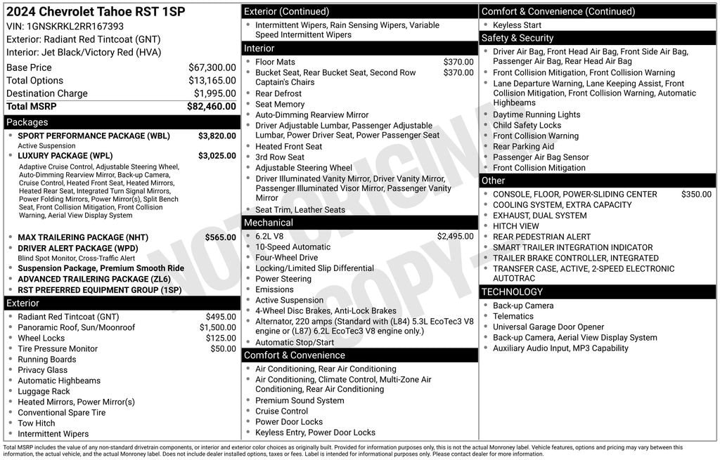 Boyd Chevrolet is proud to offer this Radiant Red Tintcoat, 2024 Tahoe RST featuring: Advanced Trailering Package (Hitch View w/Pan/Zoom Image Adjustment, Integrated Trailer Brake Controller, and Smart Trailer Integration Indicator), Driver Alert Package (Lane Change Alert w/Side Blind Zone Alert and Rear Cross Traffic Alert), Luxury Package (2nd Row Pwr Release 60/40 Split-Folding Bench Seat, 3rd Row 60/40 Power-Folding Split-Bench Seat, Adaptive Cruise Control, Enhanced Automatic Emergency Braking, HD Surround Vision, Heated 2nd Row Outboard Seats, Heated Steering Wheel, Memory Settings, Outside Heated Power-Adjustable Mirrors, Power Tilt & Telescopic Steering Column, and Rear Pedestrian Alert), Max Trailering Package (2-Speed Active Electronic AutoTrac Transfer Case and Extra Capacity Cooling System), Preferred Equipment Group 1SP (1st & 2nd Row Color-Keyed Carpeted Floor Mats, Auto-Dimming Inside Rear-View Mirror, Bose 9-Speaker Stereo Audio System Feature, Bright Front & Rear Door Sill Plates, Color-Keyed Carpeting Floor Covering, Driver & Front Outboard Passenger Airbags, Enhanced Driver Information Center, Floor Console w/Storage Area, Hands-Free Rear Power Programmable Liftgate, LED Daytime Running Lamps, Memory Settings for Driver, Remote Start, SiriusXM w/360L, Universal Home Remote, Wireless Charging, and Wrapped Steering Wheel), Sport Performance Package (Dual Exhaust System and Magnetic Ride Control Suspension), 10-Way Power Driver & Passenger Seat Adjusters, 1st, 2nd & 3rd Rows All-Weather Floor Liners (LPO), 2 USB Data Ports in Center Console Delete, 3.23 Rear Axle Ratio, 3rd row seats: split-bench, 4-Wheel Disc Brakes, 9 Speakers, ABS brakes, Air Conditioning, Alloy wheels, AM/FM radio: SiriusXM with 360L, Apple CarPlay/Android Auto, Auto High-beam Headlights, Auto-dimming Rear-View mirror, Automatic temperature control, Brake assist, Bumpers: body-color, Compass, Delay-off headlights, Driver door bin, Driver vanity mirror, Dual front impact airbags, Dual front side impact airbags, Dual-Pane Power Panoramic Sunroof, Electronic Stability Control, Emergency communication system: OnStar and Chevrolet connected services capable, Floor Console, Four wheel independent suspension, Front anti-roll bar, Front Bucket Seats, Front Center Armrest, Front dual zone A/C, Front High-Back Reclining Bucket Seats, Front reading lights, Fully automatic headlights, Garage door transmitter, Heated door mirrors, Heated Driver & Front Passenger Seats, Heated front seats, Illuminated entry, Infotainment Display, Low tire pressure warning, Memory seat, Navigation System, Occupant sensing airbag, Outside temperature display, Overhead airbag, Overhead console, Panic alarm, Passenger door bin, Passenger vanity mirror, Perforated Leather Seat Trim, Power door mirrors, Power driver seat, Power Liftgate, Power passenger seat, Power Release 2nd Row Bucket Seats, Power steering, Power windows, Premium audio system: Chevrolet Infotainment 3 Premium, Premium Smooth Ride Suspension, Radio: Chevrolet Infotainment 3 Premium System, Rain sensing wipers, Rear air conditioning, Rear anti-roll bar, Rear reading lights, Rear seat center armrest, Rear window defroster, Rear window wiper, Remote keyless entry, Roof rack: xxxxxx, Security system, Set of 4 Wheel Locks (LPO), Speed control, Speed-sensing steering, Split folding rear seat, Spoiler, Steering wheel mounted audio controls, Tachometer, Telescoping steering wheel, Tilt steering wheel, Traction control, Trailer Tire Pressure Monitor Sensors, Trip computer, Variably intermittent wipers, Voltmeter, and Wheels: 22 x 9 Bright Machined.
