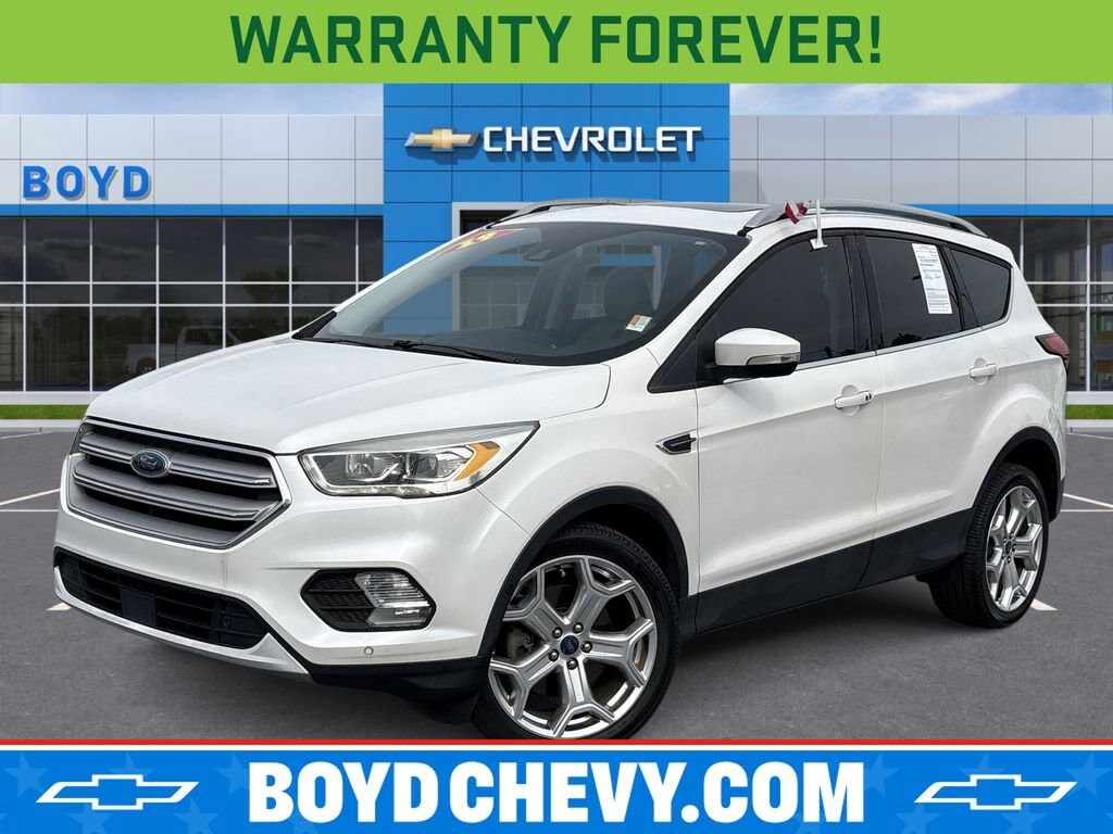 Boyd Chevrolet is proud to offer this White Platinum, 2019 Escape Titanium featuring: Equipment Group 400A, Ford Safe and Smart Titanium Plus Package (Adaptive Cruise Control & Fwd Collision Warning, Auto High-Beam Headlamps, Blind Spot Info System w/Cross-Traffic Alert, Lane-Keeping System, Panoramic Vista Roof, and Rain-Sensing Wipers), 10 Speakers, 3.07 Axle Ratio, 4-Wheel Disc Brakes, ABS brakes, Air Conditioning, Alloy wheels, AM/FM radio: SiriusXM, AppLink/Apple CarPlay and Android Auto, Auto-dimming Rear-View mirror, Automatic temperature control, Brake assist, Bumpers: body-color, Compass, Delay-off headlights, Driver door bin, Driver vanity mirror, Dual front impact airbags, Dual front side impact airbags, Electronic Stability Control, Emergency communication system: SYNC 3 911 Assist, Exterior Parking Camera Rear, FordPass Connect, Four wheel independent suspension, Front anti-roll bar, Front Bucket Seats, Front Center Armrest, Front dual zone A/C, Front fog lights, Front reading lights, Fully automatic headlights, Garage door transmitter, Heated door mirrors, Heated front seats, Heated Leather-Trimmed Front Bucket Seats, Heated steering wheel, High-Intensity Discharge Headlights, Illuminated entry, Interior Cargo Cover, Knee airbag, Leather Shift Knob, Low tire pressure warning, Memory seat, Navigation System, Occupant sensing airbag, Outside temperature display, Overhead airbag, Overhead console, Panic alarm, Passenger door bin, Passenger vanity mirror, Power door mirrors, Power driver seat, Power Liftgate, Power passenger seat, Power steering, Power windows, Radio data system, Radio: AM/FM Stereo w/MP3 Capable, Rear anti-roll bar, Rear reading lights, Rear seat center armrest, Rear window defroster, Rear window wiper, Remote keyless entry, Roof rack: rails only, Security system, Speed control, Speed-sensing steering, Split folding rear seat, Steering wheel mounted audio controls, SYNC 3 Communications & Entertainment System, Tachometer, Telescoping steering wheel, Tilt steering wheel, Traction control, Trip computer, Turn signal indicator mirrors, Variably intermittent wipers, Voice-Activated Touchscreen Navigation System, and Wheels: 19 Bright-Machined Aluminum.