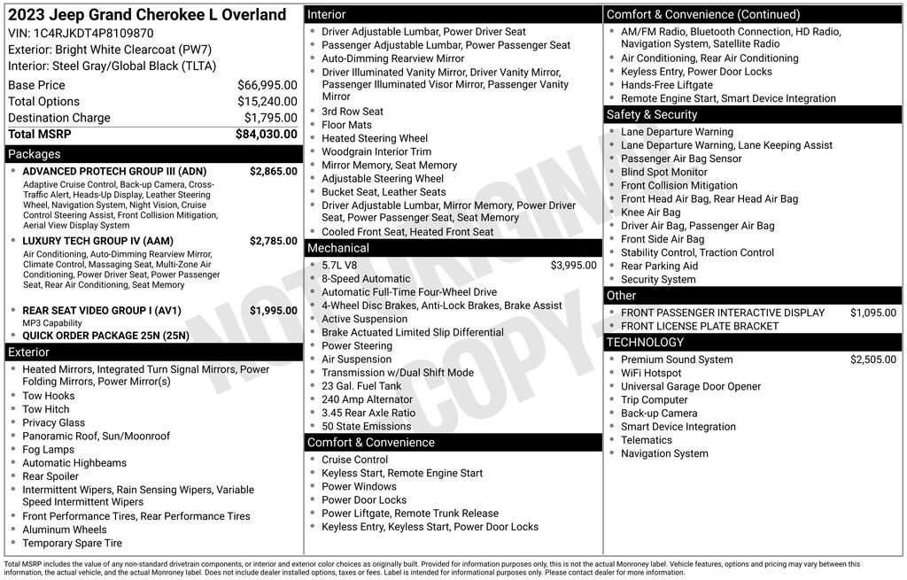 This 2023 Grand Cherokee L Overland at Boyd Chevrolet comes with lifetime powertrain coverage at no additional cost. Warranty Forever covers the engine, transmission and drive axel for the life of the vehicle with no limit on time or miles. Warranty Forever is exclusively at Boyd so come see us today! Boyd Chevy is proud to offer this Bright White Clearcoat, 2023 Grand Cherokee L Overland featuring: Check out all these great options Advanced Protech Group III (Active Driving Assist System, Heads-Up Display, Integrated Off-Road Camera, Interior Rear Facing Camera, Intersection Collision Assist System, Leather Wrapped Steering Wheel, Map-In-Cluster Display, Night Vision/Pedestrian-Animal Detection, Rear Back Up Camera Washer, and Surround View Camera System), Luxury Tech Group IV (2nd Row Manual Window Shades, ATC w/4 Zone Temp Control, Driver Power Seat Back Massage, Front Passenger Power Seat Back Massage, Nappa Leather Seats (TL), Passenger Seat Memory, Power Adjust 12-Way Driver Seat, Power Adjust 12-Way Front Passenger Seat, Rearview Autodim Digital Display Mirror, and Wireless Charging Pad), Quick Order Package 25N, Rear Seat Video Group I (Amazon Fire TV Built-In, Seatback Video Screens, and Video USB Port), Grand Cherokee L Overland, HEMI 5.7L V8 Multi Displacement VVT, 4WD, Bright White Clearcoat, Steel Gray/Global Black Leather, 10 Speakers, 19 Speakers High Performance Audio, 3.45 Rear Axle Ratio, 3rd row seats: split-bench, 4-Wheel Disc Brakes, 950 Watt Amplifier, ABS brakes, Active Noise Control System, Adaptive suspension, Air Conditioning, Alloy wheels, AM/FM radio: SiriusXM with 360L, Anti-whiplash front head restraints, Audio memory, Auto High-beam Headlights, Auto-dimming door mirrors, Auto-dimming Rear-View mirror, Auto-leveling suspension, Automatic temperature control, Brake assist, Bumpers: body-color, Compass, Delay-off headlights, Driver door bin, Driver vanity mirror, Dual front impact airbags, Dual front side impact airbags, Electronic Stability Control, Emergency communication system, Four wheel independent suspension, Front anti-roll bar, Front Bucket Seats, Front Center Armrest w/Storage, Front dual zone A/C, Front fog lights, Front License Plate Bracket, Front Passenger Interactive Display, Front reading lights, Fully automatic headlights, Garage door transmitter, Heated door mirrors, Heated front seats, Heated rear seats, Heated steering wheel, Illuminated entry, Knee airbag, Low tire pressure warning, Memory seat, Nappa Leather Seats, Navigation System, Normal Duty Suspension, Occupant sensing airbag, Outside temperature display, Overhead airbag, Overhead console, Panic alarm, Passenger door bin, Passenger vanity mirror, Power door mirrors, Power driver seat, Power Fold Seatbacks, Power Liftgate, Power moonroof, Power passenger seat, Power steering, Power windows, Radio data system, Radio: Uconnect 5 Nav w/10.1 Display, Rain sensing wipers, Rear air conditioning, Rear anti-roll bar, Rear reading lights, Rear window defroster, Rear window wiper, Reclining 3rd row seat, Remote keyless entry, Security system, Speed control, Speed-Sensitive Wipers, Split folding rear seat, Spoiler, Steering wheel memory, Steering wheel mounted audio controls, Tachometer, Telescoping steering wheel, Tilt steering wheel, Traction control, Trip computer, Turn signal indicator mirrors, Variably intermittent wipers, Ventilated front seats, Voltmeter, and Wheels: 20 x 8.5 Machined Face Aluminum. Grand Cherokee L Overland, HEMI 5.7L V8 Multi Displacement VVT, 4WD, Bright White Clearcoat, Steel Gray/Global Black Leather, 2nd Row Manual Window Shades, Active Driving Assist System, Advanced Protech Group III, Amazon Fire TV Built-In, ATC w/4 Zone Temp Control, Driver Power Seat Back Massage, Front Passenger Power Seat Back Massage, Heads-Up Display, Integrated Off-Road Camera, Interior Rear Facing Camera, Intersection Collision Assist System, Leather Wrapped Steering Wheel, Luxu