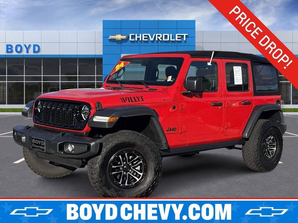 Boyd Chevrolet is proud to offer this Firecracker Red Clearcoat, 2024 Wrangler Willys featuring: Convenience Group (2-Door Passive Entry, Front Door Locks, Air Conditioning w/Auto Temperature Control, Air Filtering, Cluster 7.0 TFT Color Display, Emergency/Assistance Call, Heated Front Seats, Heated Steering Wheel, Remote Start System, and Universal Garage Door Opener), Quick Order Package 24W Willys (240 Amp Alternator, 4-Wheel Drive Swing Gate Decal, 7 & 4 Pin Wiring Harness, 97 MPH Vehicle Max Speed Calibration, Advanced Brake Assist, Automatic Headlamps, Auxiliary Switches, Black Grille, Class II Receiver Hitch, Conventional Differential Front Axle, Corning Gorilla Glass, Dana M210 Wide HD Tube Front Axle, Dana M220 Wide Rear Axle, Daytime Running Lamps LED Accents, Deep Tint Sunscreen Windows, E-Locker Rear Axle, Enhanced Adaptive Cruise Control, Front 1-Touch Down Power Windows, Front LED Fog Lamps, Full Speed Forward Collision Warning Plus, Injection Molded Black Rear Bumper, LED Premium Reflector Headlamps, Mold In Color Bumper w/Gloss Black, Molded in Color Rubicon Highline Flare, MOPAR All-Weather Floor Mats, Off-Road Plus Mode, Power Heated Mirrors, Premium Wrapped Steering Wheel, Remote Keyless Entry, Security Alarm, Speed Sensitive Power Locks, Sun Visors w/Illuminated Vanity Mirrors, Wheels: 17 x 7.5 Painted Black, Willy's Suspension, Willys, and Willys Hood Decal), Safety Group (Auto High Beam Headlamp Control, Blind Spot & Cross Path Detection, LED Taillamps, and ParkSense Rear Park Assist System), Xtreme 35 Tire Package (35 Tire Suspension, Anti-Lock 4-Wheel Disc Perf Brakes, MOPAR Hinge-Gate Reinforcement, Wheel Flare Extensions, and Wheels: 17 x 8 Machined w/Black Pockets), 110 MPH Vehicle Max Speed Calibration, 4-Wheel Disc Brakes, 8 Speakers, ABS brakes, Air Conditioning, AM/FM radio, Apple CarPlay/Android Auto, Aux Battery, Brake assist, Cloth Low-Back Bucket Seats, Compass, Delay-off headlights, Driver door bin, Driver vanity mirror, Dual front impact airbags, Dual front side impact airbags, Electronic Stability Control, Front anti-roll bar, Front Bucket Seats, Front Center Armrest w/Storage, Front fog lights, Front reading lights, Integrated roll-over protection, Low tire pressure warning, Non-Lock Fuel Cap w/o Discriminator, Normal Duty Suspension, Occupant sensing airbag, Outside temperature display, Overhead airbag, ParkView Rear Back-Up Camera, Passenger door bin, Passenger vanity mirror, Power steering, Radio data system, Radio: Uconnect 5 w/12.3 Display, Rear anti-roll bar, Rear reading lights, Speed control, Split folding rear seat, Steering wheel mounted audio controls, Stop-Start Dual Battery System, Tachometer, Telescoping steering wheel, Tilt steering wheel, Traction control, Trip computer, Variably intermittent wipers, and Wheels: 17 x 7.5 Black Steel Styled.Odometer is 5881 miles below market average!18/23 City/Highway MPGCheck out all these great options Convenience Group (2-Door Passive Entry, Front Door Locks, Air Conditioning w/Auto Temperature Control, Air Filtering, Cluster 7.0 TFT Color Display, Emergency/Assistance Call, Heated Front Seats, Heated Steering Wheel, Remote Start System, and Universal Garage Door Opener), Quick Order Package 24W Willys (240 Amp Alternator, 4-Wheel Drive Swing Gate Decal, 7 & 4 Pin Wiring Harness, 97 MPH Vehicle Max Speed Calibration, Advanced Brake Assist, Automatic Headlamps, Auxiliary Switches, Black Grille, Class II Receiver Hitch, Conventional Differential Front Axle, Corning Gorilla Glass, Dana M210 Wide HD Tube Front Axle, Dana M220 Wide Rear Axle, Daytime Running Lamps LED Accents, Deep Tint Sunscreen Windows, E-Locker Rear Axle, Enhanced Adaptive Cruise Control, Front 1-Touch Down Power Windows, Front LED Fog Lamps, Full Speed Forward Collision Warning Plus, Injection Molded Black Rear Bumper, LED Premium Reflector Headlamps, Mold In Color Bumper w/Gloss Black, Molded in Color Rubicon Highline Flare, MOPAR All-