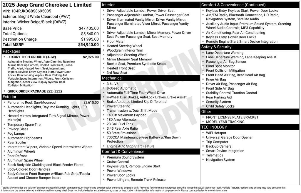 Boyd Chevrolet is proud to offer this Bright White Clearcoat, 2025 Grand Cherokee L Limited featuring: Luxury Tech Group II (2nd Row Manual Window Shades, Auto-Dimming Exterior Driver Mirror, Capri Leatherette with Axis II Seats, Integrated Off-Road Camera, Intersection Collision Assist System, Memory Steering Column, ParkSense Front/Rear Park Assist with Stop, Passive Entry - Front/Rear Doors, Liftgate, Power Tilt/Telescope Steering Column, Rain Sensitive Windshield Wipers, Rear Back Up Camera Washer, Rearview Autodim Digital Display Mirror, Surround View Camera System, Ventilated Front Seats, and Wireless Charging Pad), Quick Order Package 22E, 3.45 Rear Axle Ratio, 3rd row seats: split-bench, 4-Wheel Disc Brakes, 6 Speakers, ABS brakes, Active Noise Control System, Air Conditioning, Alloy wheels, AM/FM radio: SiriusXM with 360L, Anti-whiplash front head restraints, Audio memory, Auto High-beam Headlights, Automatic temperature control, Brake assist, Bumpers: body-color, Capri Leatherette Seats, Compass, Delay-off headlights, Driver door bin, Driver vanity mirror, Dual front impact airbags, Dual front side impact airbags, Dual-Pane Panoramic Sunroof, Electronic Stability Control, Emergency communication system, Four wheel independent suspension, Front anti-roll bar, Front Bucket Seats, Front Center Armrest w/Storage, Front dual zone A/C, Front fog lights, Front License Plate Bracket, Front reading lights, Fully automatic headlights, Garage door transmitter, Heated door mirrors, Heated front seats, Heated rear seats, Heated steering wheel, Illuminated entry, Interior Rear Facing Camera, Knee airbag, Low tire pressure warning, Manual Fold Seatbacks, Memory seat, Model Year Tracking, Navigation System, Normal Duty Suspension, Occupant sensing airbag, Outside temperature display, Overhead airbag, Overhead console, Panic alarm, ParkView Rear Back-Up Camera, Passenger door bin, Passenger vanity mirror, Power door mirrors, Power driver seat, Power Liftgate, Power passenger seat, Power steering, Power windows, Radio data system, Radio: Uconnect 5 Nav with 10.1 Display, Rear air conditioning, Rear anti-roll bar, Rear reading lights, Rear window defroster, Rear window wiper, Reclining 3rd row seat, Remote keyless entry, Security system, Speed control, Speed-Sensitive Wipers, Split folding rear seat, Spoiler, Steering wheel mounted audio controls, Tachometer, Telescoping steering wheel, Tilt steering wheel, Traction control, Trip computer, Turn signal indicator mirrors, Variably intermittent wipers, Voltmeter, and Wheels: 18 x 8.0 Polished/Painted Aluminum.Odometer is 4524 miles below market average!18/25 City/Highway MPGCheck out all these great options Luxury Tech Group II (2nd Row Manual Window Shades, Auto-Dimming Exterior Driver Mirror, Capri Leatherette with Axis II Seats, Integrated Off-Road Camera, Intersection Collision Assist System, Memory Steering Column, ParkSense Front/Rear Park Assist with Stop, Passive Entry - Front/Rear Doors, Liftgate, Power Tilt/Telescope Steering Column, Rain Sensitive Windshield Wipers, Rear Back Up Camera Washer, Rearview Autodim Digital Display Mirror, Surround View Camera System, Ventilated Front Seats, and Wireless Charging Pad), Quick Order Package 22E, 3.45 Rear Axle Ratio, 3rd row seats: split-bench, 4-Wheel Disc Brakes, 6 Speakers, ABS brakes, Active Noise Control System, Air Conditioning, Alloy wheels, AM/FM radio: SiriusXM with 360L, Anti-whiplash front head restraints, Audio memory, Auto High-beam Headlights, Automatic temperature control, Brake assist, Bumpers: body-color, Capri Leatherette Seats, Compass, Delay-off headlights, Driver door bin, Driver vanity mirror, Dual front impact airbags, Dual front side impact airbags, Dual-Pane Panoramic Sunroof, Electronic Stability Control, Emergency communication system, Four wheel independent suspension, Front anti-roll bar, Front Bucket Seats, Front Center Armrest w/Storage, Front dual zone A/C, Front fog lights, Fr