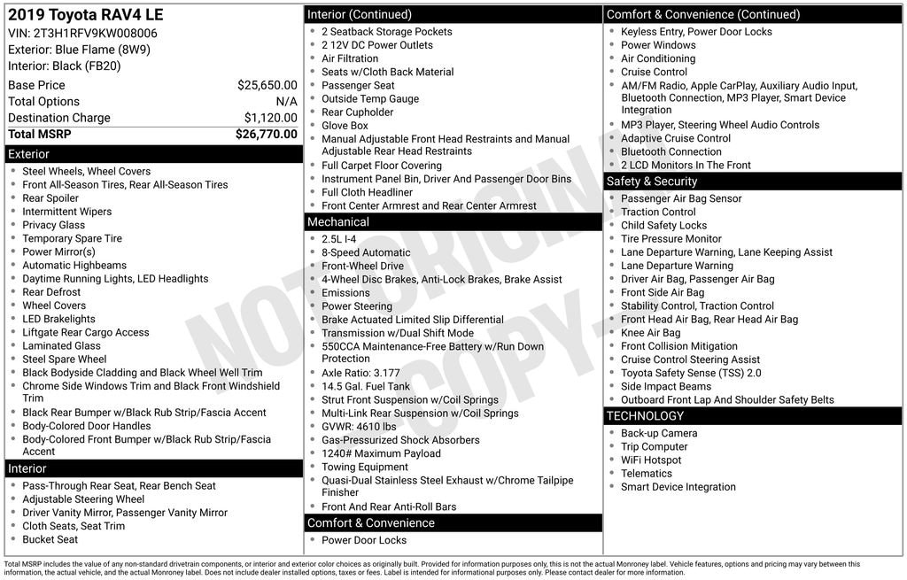 As an official Kelley Blue Book® Buying Center, weâll buy your vehicle even if you donât buy one from us! Get your Official Check out all these great options 17 Wheels, 4-Wheel Disc Brakes, 6 Speakers, ABS brakes, Air Conditioning, AM/FM radio, Apple CarPlay, Auto High-beam Headlights, Axle Ratio: 3.177, Brake assist, Bumpers: body-color, Driver door bin, Driver vanity mirror, Dual front impact airbags, Dual front side impact airbags, Electronic Stability Control, Emergency communication system: Entune Safety Connect, Exterior Parking Camera Rear, Fabric Seat Trim, Four wheel independent suspension, Front anti-roll bar, Front Bucket Seats, Front Center Armrest, Front reading lights, Illuminated entry, Knee airbag, Low tire pressure warning, Occupant sensing airbag, Outside temperature display, Overhead airbag, Overhead consol
