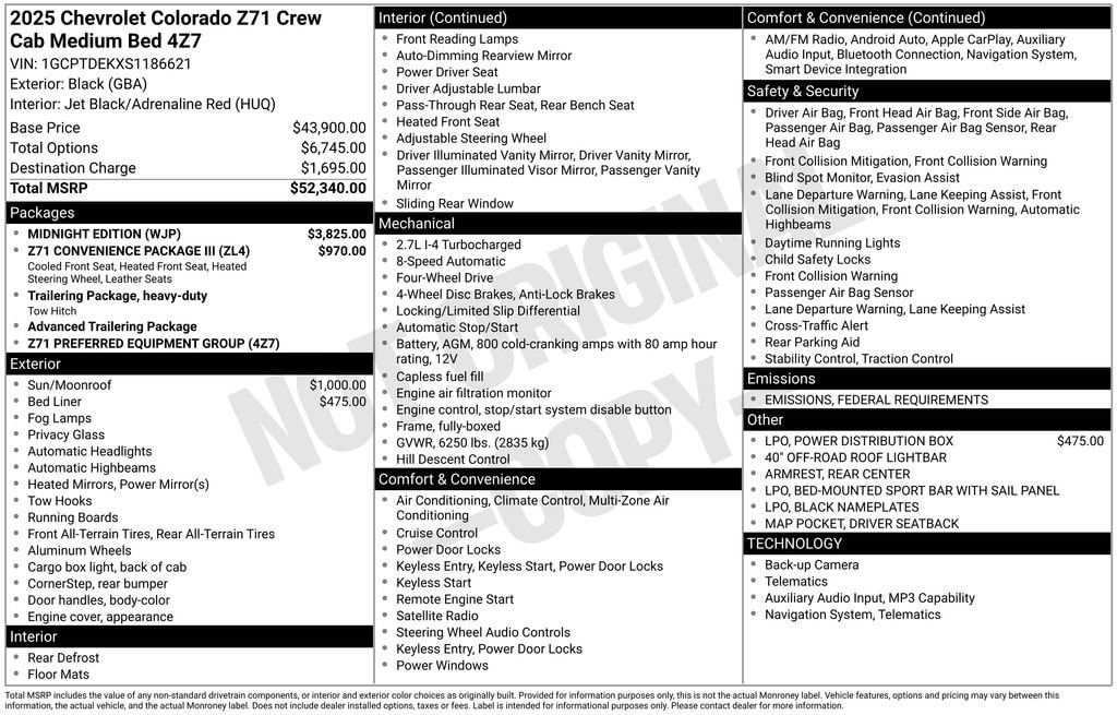 Boyd Chevrolet is proud to offer this Black, 2025 Colorado Z71. Come see us, we're right down the road in Hendersonville and we are proud to offer this Black, 2025 Colorado Z71 featuring: Colorado Z71, 4D Crew Cab, 2.7L I4 Turbocharged DOHC 16V LEV3-ULEV50 310hp, 8-Speed Automatic, 4WD, Black, Jet Black/Adrenaline Red Leather, 40 Off-Road Roof Light Bar (LPO), Automatic Emergency Braking, Bed-Mounted Sport Bar w/Sail Panel (LPO), Black Assist Steps, Black Nameplates (LPO), Chevy Safety Assist, Driver & Front Passenger Ventilated Seats, Driver Memory Settings, Driver Seatback Map Pocket, Following Distance Indicator, Forward Collision Alert, Front Black Recovery Hooks, Front Pedestrian & Bicyclist Braking, Heated Steering Wheel, IntelliBeam Automatic High Beam On/Off, Lane Keep Assist w/Lane Departure Warning, Midnight Edition, Perforated Leather-Appointed Seat Trim, Preferred Equipment Group 4Z7, Rear Center Armrest, Wheels: 18 x 8 High Gloss Black Painted Aluminum, Z71 Convenience Package III.