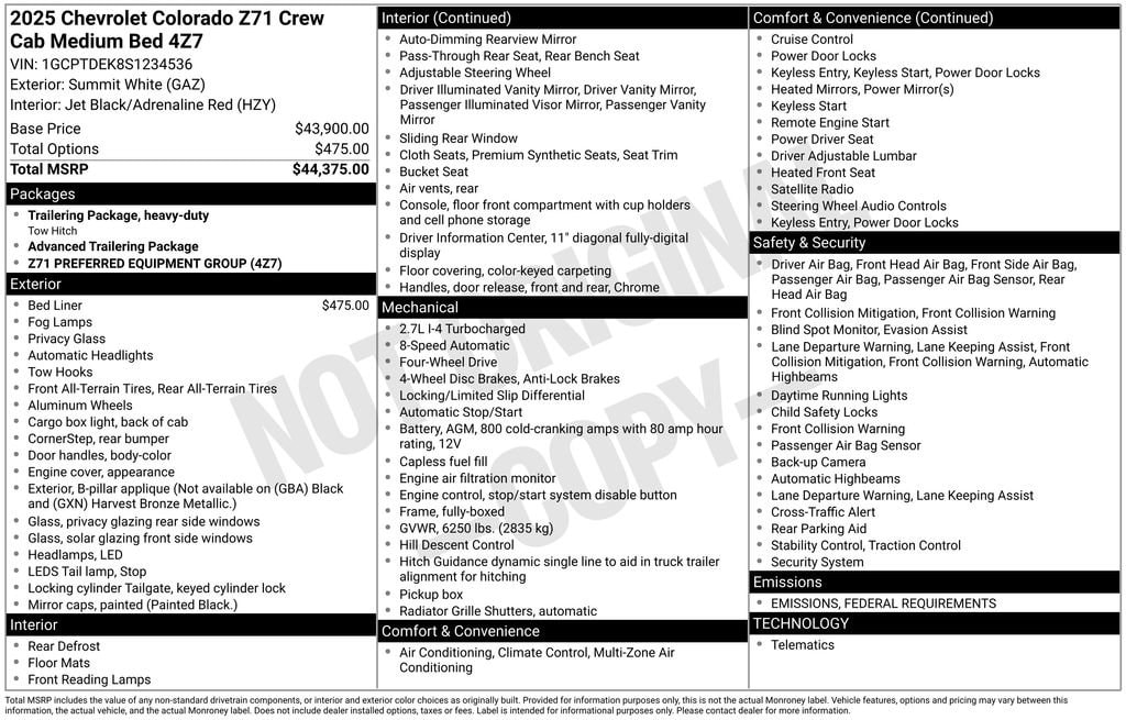 Boyd Chevrolet is proud to offer this Summit White, 2025 Colorado Z71. Come see us, we're right down the road in Hendersonville and we are proud to offer this Summit White, 2025 Colorado Z71 featuring: Colorado Z71, 4D Crew Cab, 2.7L I4 Turbocharged DOHC 16V LEV3-ULEV50 310hp, 8-Speed Automatic, 4WD, Summit White, Jet Black/Adrenaline Red Cloth, Automatic Emergency Braking, Chevy Safety Assist, Following Distance Indicator, Forward Collision Alert, Front Pedestrian & Bicyclist Braking, IntelliBeam Automatic High Beam On/Off, Lane Keep Assist w/Lane Departure Warning, Preferred Equipment Group 4Z7.