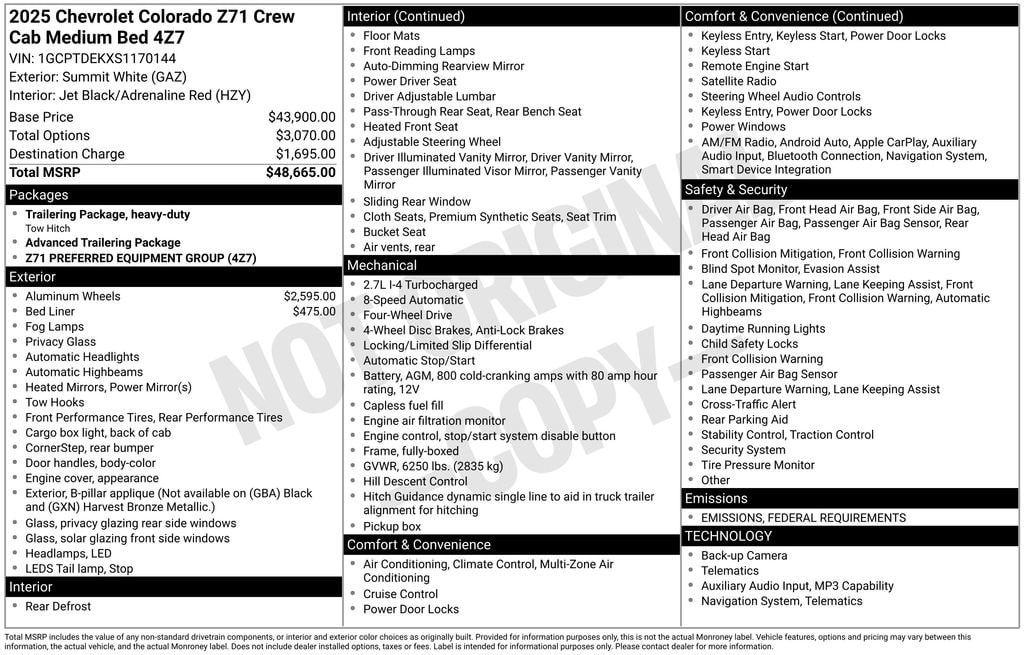 Boyd Chevrolet is proud to offer this Summit White, 2025 Colorado Z71. Come see us, we're right down the road in Hendersonville and we are proud to offer this Summit White, 2025 Colorado Z71 featuring: Colorado Z71, 4D Crew Cab, 2.7L I4 Turbocharged DOHC 16V LEV3-ULEV50 310hp, 8-Speed Automatic, 4WD, Summit White, Jet Black/Adrenaline Red Cloth, Automatic Emergency Braking, Chevy Safety Assist, Following Distance Indicator, Forward Collision Alert, Front Pedestrian & Bicyclist Braking, IntelliBeam Automatic High Beam On/Off, Lane Keep Assist w/Lane Departure Warning, Preferred Equipment Group 4Z7.