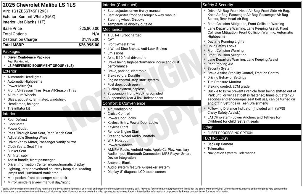 28/36 City/Highway MPGCheck out all these great options Preferred Equipment Group 1LS, 16 Aluminum Wheels, 4-Wheel Disc Brakes, 6 Speakers, 6-Speaker Audio System Feature, 6-Way Manual Driver Seat Adjuster, 6-Way Manual Front Passenger Seat Adjuster, ABS brakes, Air Conditioning, Alloy wheels, AM/FM radio, Auto High-beam Headlights, Brake assist, Bumpers: body-color, Compass, Delay-off headlights, Driver door bin, Driver vanity mirror, Dual front impact airbags, Dual front side impact airbags, Electronic Stability Control, Emergency communication system: OnStar and Chevrolet connected services capable, Exterior Parking Camera Rear, Four wheel independent suspension, Front anti-roll bar, Front Bucket Seats, Front Center Armrest, Front reading lights, Fully automatic headlights, Illuminated entry, Knee airbag, Low tire pressure warning, Occupant sensing airbag, Outside temperature display, Overhead airbag, Overhead console, Panic alarm, Passenger door bin, Passenger vanity mirror, Power door mirrors, Power steering, Power windows, Premium audio system: Chevrolet Infotainment 3, Premium Cloth Seat Trim, Radio data system, Radio: Chevrolet Infotainment 3 System, Rear anti-roll bar, Rear side impact airbag, Rear window defroster, Remote keyless entry, Security system, Speed control, Split folding rear seat, Steering wheel mounted audio controls, Tachometer, Telescoping steering wheel, Tilt steering wheel, Traction control, Trip computer, Variably intermittent wipers, Voltmeter, and Wireless Apple CarPlay/Android Auto Located at 1875 Spartanburg Hwy, Hendersonville, NC, Boyd Chevrolet has proudly served Western North Carolina and Upstate South Carolina since 1932. Weâre committed to our communities including Asheville, Fletcher, Hendersonville, Hickory, Spartanburg, Gastonia, Boone, Charlotte, Johnson City, and Knoxville, as well as the broader regions of North Carolina, South Carolina, Virginia, and Tennessee.As an official Kelley Blue Book® Buying Center, weâll buy your vehicle even if you donât buy one from us! Get your Official Check out all these great options Preferred Equipment Group 1LS, 16 Aluminum Wheels, 4-Wheel Disc Brakes, 6 Speakers, 6-Speaker Audio System Feature, 6-Way Manual Driver Seat Adjuster, 6-Way Manual Front Passenger Seat Adjuster, ABS brakes, Air Conditioning, Alloy wheels, AM/FM radio, Auto High-beam Headlights, Brake assist, Bumpers: body-color, Compass, Delay-off headlights, Driver door bin, Driver vanity mirror, Dual front impact airbags, Dual front side impact airbags, Electronic Stability Control, Emergency communication system: OnStar and Chevrolet connected services capable, Exterior Parking Camera Rear, Four wheel independent suspension, Front anti-roll bar, Front Bucket Seats, Front Center Armrest, Front reading lights, Fully automatic headlights, Illuminated entry, Knee airbag, Low tire pressure warning, Occupant sensing airbag, Outside temperature display, Overhead airbag, Overhead console, Panic alarm, Passenger door bin, Passenger vanity mirror, Power door mirrors, Power steering, Power windows, Premium audio system: Chevrolet Infotainment 3, Premium Cloth Seat Trim, Radio data system, Radio: Chevrolet Infotainment 3 System, Rear anti-roll bar, Rear side impact airbag, Rear window defroster, Remote keyless entry, Security system, Speed control, Split folding rear seat, Steering wheel mounted audio controls, Tachometer, Telescoping steering wheel, Tilt steering wheel, Traction control, Trip computer, Variably intermittent wipers, Voltmeter, and Wireless Apple CarPlay/Android Auto Instant Cash Offer today at BoydChevy.com.Call (828) 693-3461 for availability or to schedule your test drive.*Confidence Comes Standard at Boyd Chevrolet.* All Year End Savings include discounts, Customer Cash, Customer Bonus Cash, Bonus Cash, Select Market Purchase Bonus Cash, and require GM Financial financing. Not all Savings can be combined with leasing.