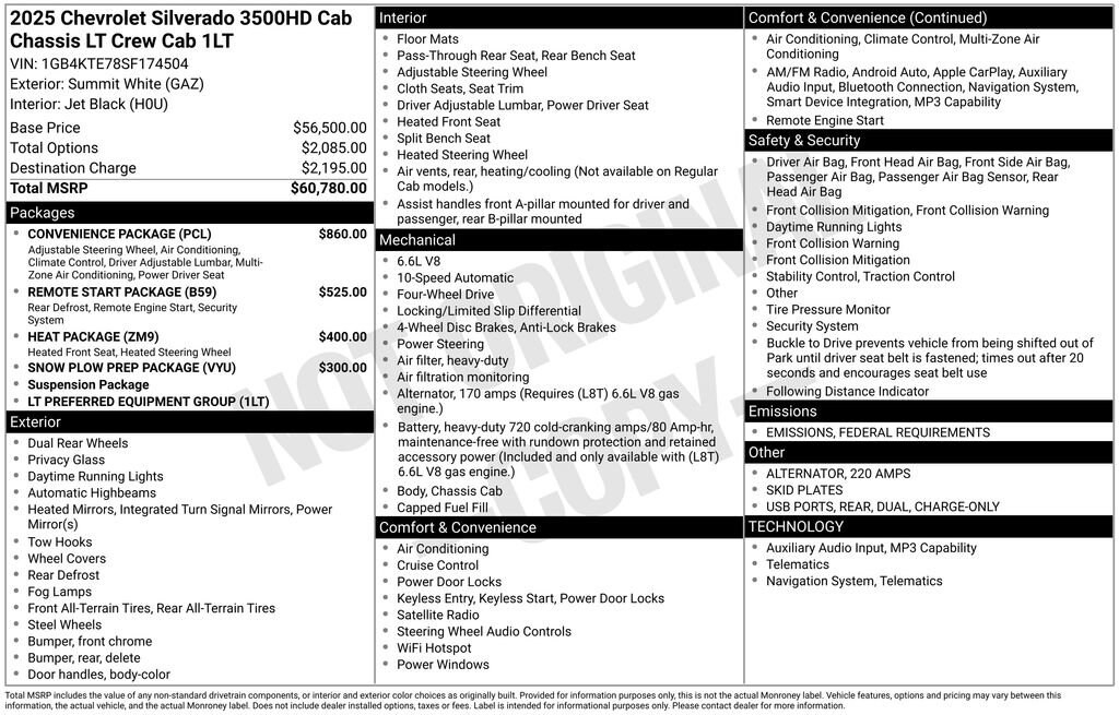 Boyd Chevrolet is proud to offer this Summit White, 2025 Silverado 3500HD LT featuring: 10-Speed Automatic, 4WD, Black Cloth.Check out all these great options Convenience Package (10-Way Power Driver Seat Adjuster w/Lumbar, Dual-Zone Automatic Climate Control, Front LED Fog Lamps, and Manual Tilt-Wheel/Telescoping Steering Column), Heat Package (Heated Driver & Front Outboard Passenger Seats and Heated Steering Wheel), Preferred Equipment Group 1LT (170 Amp Alternator, 2-Speed Electronic Shift Transfer Case, 4-Way Manual Driver Seat Adjuster, Black Mirror Caps, Bluetooth® For Phone, Color-Keyed Carpeting Floor Covering, Compass Located In Instrument Cluster, Deep-Tinted Glass, Keyless Open & Start, Power Rear Windows w/Express Down, Rear 60/40 Folding Bench Seat (Folds Up), Steering Wheel Audio Controls, Steering Wheel Mounted Electronic Cruise Control, and Wrapped Steering Wheel), Remote Start Package (Electric Rear-Window Defogger, Remote Vehicle Starter System, and Unauthorized Entry Theft-Deterrent System), Snow Plow Prep Package (220 Amp Alternator), Suspension Package, 10-Speed Automatic, 4WD, Black Cloth, 17 Painted Steel Wheels, 3.73 Rear Axle Ratio, 4-Way Manual Passenger Seat Adjuster, 4-Wheel Disc Brakes, 6 Speakers, 6-Speaker Audio System Feature, ABS brakes, Air Conditioning, AM/FM radio: SiriusXM, Auto High-beam Headlights, Black Frame-Mounted Front Recovery Hooks, Brake assist, Bumpers: chrome, Chrome Front Grille Bar, Cloth Seat Trim, Compass, Delay-off headlights, Driver door bin, Driver vanity mirror, Dual front impact airbags, Dual front side impact airbags, Dual rear wheels, Electronic Stability Control, Enhanced 12.3 Diagonal Driver Information Center, Front 40/20/40 Split-Bench Seat, Front anti-roll bar, Front Center Armrest w/Storage, Front reading lights, Front Rubberized Vinyl Floor Mats, Front wheel independent suspension, Fully automatic headlights, Heated door mirrors, Heavy-Duty 80 Amp-Hr Battery, Illuminated entry, Low tire pressure warning, Manual Tilt Inside Rearview Mirror, Occupant sensing airbag, OnStar Services Capable, Outside temperature display, Overhead airbag, Overhead console, Panic alarm, Passenger door bin, Passenger vanity mirror, Power door mirrors, Power steering, Power windows, Radio: Chevrolet Infotainment 3 Premium System, Rear reading lights, Rear Rubberized-Vinyl Floor Mats, Remote keyless entry, SiriusXM Trial Subscription, Speed control, Split folding rear seat, Steering wheel mounted audio controls, Tachometer, Tilt steering wheel, Traction control, Trip computer, Turn signal indicator mirrors, Variably intermittent wipers, and Voltmeter Located at 1875 Spartanburg Hwy, Hendersonville, NC, Boyd Chevrolet has proudly served Western North Carolina and Upstate South Carolina since 1932. Weâre committed to our communities including Asheville, Fletcher, Hendersonville, Hickory, Spartanburg, Gastonia, Boone, Charlotte, Johnson City, and Knoxville, as well as the broader regions of North Carolina, South Carolina, Virginia, and Tennessee.As an official Kelley Blue Book® Buying Center, weâll buy your vehicle even if you donât buy one from us! Get your Official Check out all these great options Convenience Package (10-Way Power Driver Seat Adjuster w/Lumbar, Dual-Zone Automatic Climate Control, Front LED Fog Lamps, and Manual Tilt-Wheel/Telescoping Steering Column), Heat Package (Heated Driver & Front Outboard Passenger Seats and Heated Steering Wheel), Preferred Equipment Group 1LT (170 Amp Alternator, 2-Speed Electronic Shift Transfer Case, 4-Way Manual Driver Seat Adjuster, Black Mirror Caps, Bluetooth® For Phone, Color-Keyed Carpeting Floor Covering, Compass Located In Instrument Cluster, Deep-Tinted Glass, Keyless Open & Start, Power Rear Windows w/Express Down, Rear 60/40 Folding Bench Seat (Folds Up), Steering Wheel Price does not include taxes, tag & fees, or dealer installed equipment. Includes: $1000 - Chevrolet Consumer Cash Program. Exp. 1