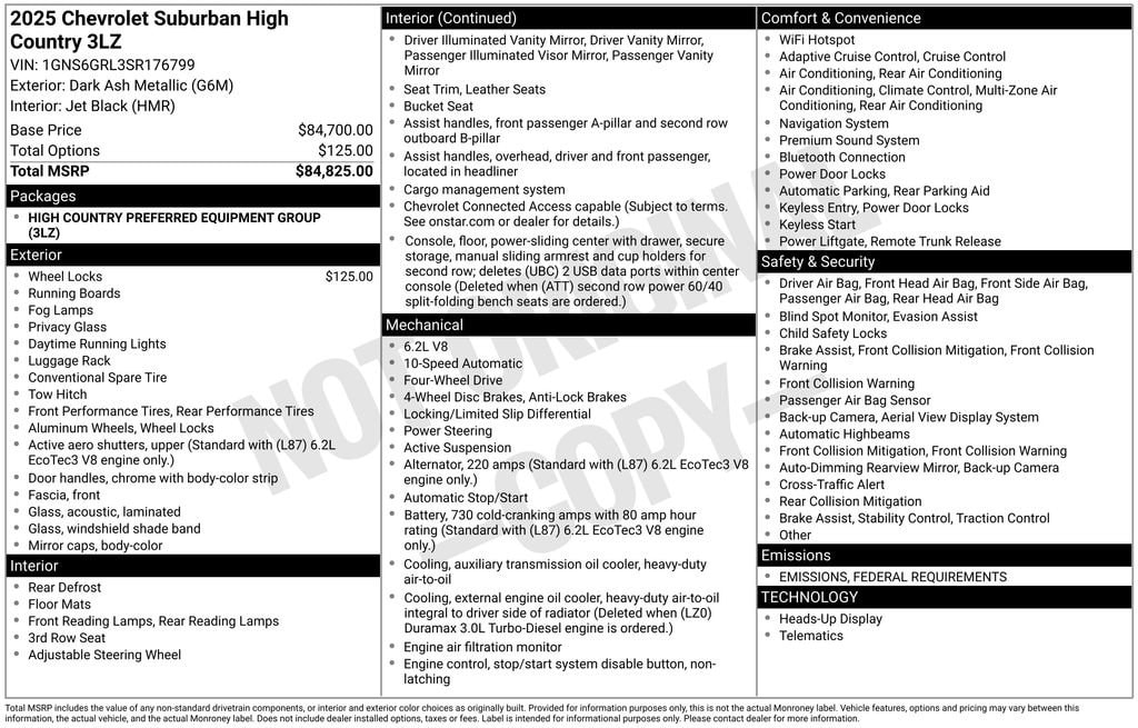 Boyd Chevrolet is proud to offer this Dark Ash Metallic, 2025 Suburban High Country. Come see us, we're right down the road in Hendersonville and we are proud to offer this Dark Ash Metallic, 2025 Suburban High Country featuring: Suburban High Country, 4D Sport Utility, EcoTec3 6.2L V8, 10-Speed Automatic with Overdrive, 4WD, Dark Ash Metallic, Jet Black Leather.