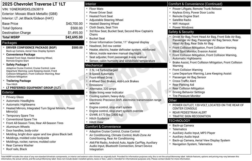 As an official Kelley Blue Book® Buying Center, weâll buy your vehicle even if you donât buy one from us! Get your Official Check out all these great options Traverse LT 1LT, 4D Sport Utility, 2.5L DOHC, 8-Speed Automatic, FWD, Mosaic Black Metallic, Lt Jet Black/Gideon Cloth, 3rd row seats: split-bench, 4-Way Manual Front Passenger Seat Adjuster, 4-Wheel Disc Brakes, 6 Speakers, 6-Speaker Audio System Feature, 8-Way Power Driver Seat Adjuster, ABS brakes, Air Conditioning, Alloy wheels, AM/FM radio: SiriusXM with 360L, Apple CarPlay/Android Auto, Auto High-beam Headlights, Automatic temperature control, Brake assist, Bumpers: body-color, Child-Seat-Sensing Airbag, Compass, Delay-off headlights, Driver door bin, Driver vanity mirror, Dual front impact airbags, Dual front side impact airbags, Electronic Stability Control, Four wheel independent suspension, Front anti-roll bar, Front Bucket Seats, Front Center Armrest, Front dual zone A/C, Front reading lights, Fully automatic headlights, Heated door mirrors, Heated front seats, Heated steering wheel, Illuminated entry, Low tire pressure warning, Navigation System, Occupant sensing airbag, Outside temperature display, Overhead airbag, Overhead console, Panic alarm, Passenger door bin, Passenger vanity mirror, Power door mirrors, Power driver seat, Power Liftgate, Power steering, Power windows, Premium Cloth Seat Trim, Radio data system, Rear air conditioning, Rear anti-roll bar, Rear reading lights, Rear window defroster, Rear window wiper, Remote keyless entry, Security system, Speed control, Speed-sensing steering, Spoiler, Steering wheel mounted audio controls, Tachometer, T