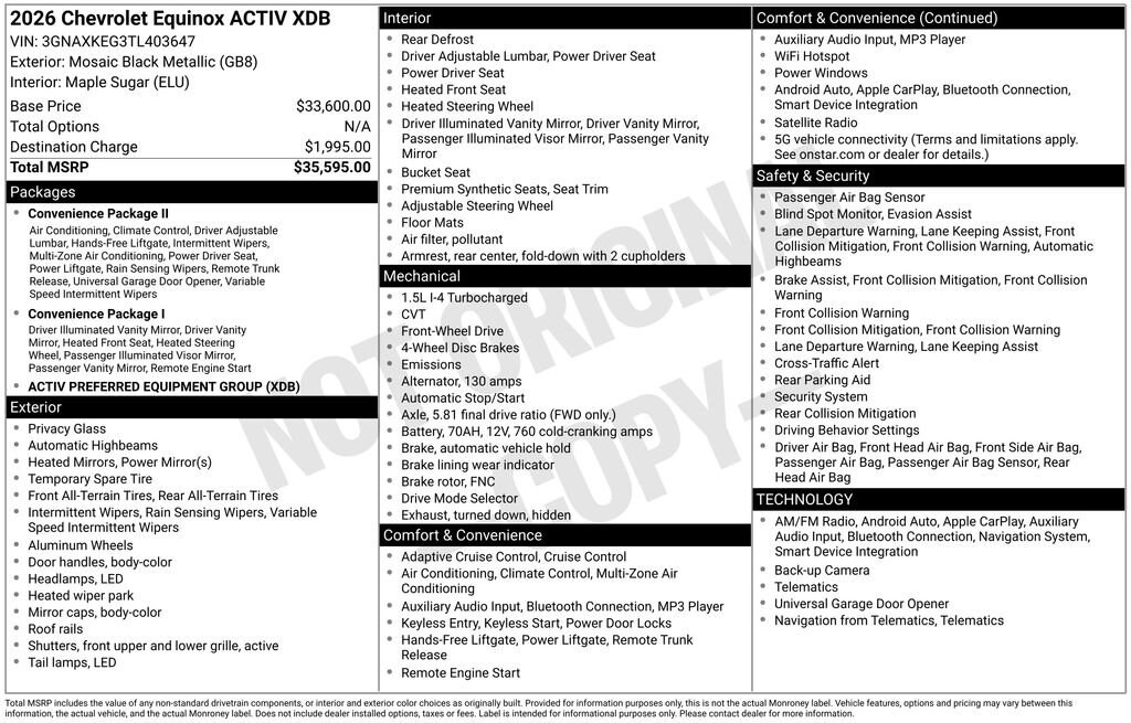 Check out all these great options Preferred Equipment Group XDB, 2-Way Power Driver Lumbar Control Seat Adjuster, 4-Wheel Disc Brakes, 5.81 Final Drive Axle Ratio, 6 Speakers, ABS brakes, Air Conditioning, Alloy wheels, AM/FM radio: SiriusXM, Auto High-beam Headlights, Automatic temperature control, Brake assist, Bumpers: body-color, Compass, Delay-off headlights, Driver 8-Way Power Seat Adjuster, Driver door bin, Driver vanity mirror, Dual front impact airbags, Dual front side impact airbags, Electronic Stability Control, Emergency communication system: OnStar and Chevrolet connected services capable, Four wheel independent suspension, Front anti-roll bar, Front Bucket Seats, Front Center Armrest, Front dual zone A/C, Front Passenger 4-Way Manual Seat Adjuster, Front reading lights, Fully automatic headlights, Garage door transmitter, Heated door mirrors, Heated Driver and Front Passenger Seats, Heated front seats, Heated steering wheel, Illuminated entry, Low tire pressure warning, Navigation System, Occupant sensing airbag, Outside temperature display, Overhead airbag, Overhead console, Panic alarm, Passenger door bin, Passenger vanity mirror, Power door mirrors, Power driver seat, Power Liftgate, Power steering, Power windows, Premium audio system: Chevrolet Infotainment 3 Plus, Radio data system, Radio: 11.3 Diagonal Advanced Color LCD Display, Rain sensing wipers, Rear anti-roll bar, Rear reading lights, Rear seat center armrest, Rear window defroster, Rear window wiper, Remote keyless entry, Security system, SiriusXM with 360L Trial Subscription, Speed control, Speed-sensing steering, Split folding rear seat, Spoiler, Steering wheel mounted audio controls, Sueded Microfiber Seat Trim, Tachometer, Telescoping steering wheel, Tilt steering wheel, Traction control, Trip computer, Variably intermittent wipers, and Wheels: 17 Dark Android Painted Machined-Face Located at 1875 Spartanburg Hwy, Hendersonville, NC, Boyd Chevrolet has proudly served Western North Carolina and Upstate South Carolina since 1932. Weâre committed to our communities including Asheville, Fletcher, Hendersonville, Hickory, Spartanburg, Gastonia, Boone, Charlotte, Johnson City, and Knoxville, as well as the broader regions of North Carolina, South Carolina, Virginia, and Tennessee.