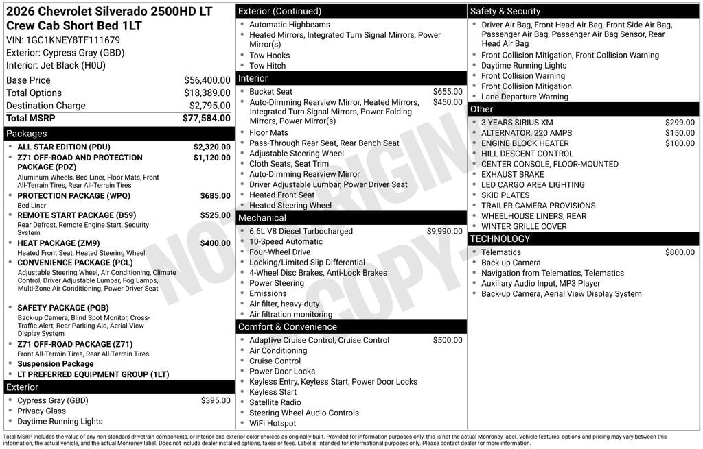 Check out all these great options All Star Edition, Convenience Package (10-Way Power Driver Seat Adjuster with Lumbar, Dual-Zone Automatic Climate Control, Front LED Fog Lamps, LED Cargo Area Lighting, and Manual Tilt and Telescoping Steering Column), Heat Package (Heated Driver and Front Outboard Passenger Seating and Heated Steering Wheel), Preferred Equipment Group 1LT (120-Volt Bed Mounted Power Outlet, 120-Volt Interior Power Outlet, 17 Machined Aluminum Wheels, 170 Amp Alternator, 2-Speed Electronic Shift Transfer Case, 4-Way Manual Driver Seat Adjuster, Black Mirror Caps, Bluetooth® For Phone, Chevrolet Connected Access Capable, Color-Keyed Carpeting Floor Covering, Compass, Deep-Tinted Glass, Durabed Pickup Bed, Electronic Cruise Control with Set and Resume Speed, EZ Lift Power Lock and Release Tailgate, Front Rubberized Vinyl Floor Mats, Halogen Reflector Headlamps, HD Rear Vision Camera, Heated Vertical Trailering Mirrors, Keyless Open and Start, OnStar Services Capable, Power Door Locks, Power Front Windows with Driver Express Up/Down, Power Front Windows with Passenger Express Down, Power Rear Windows with Express Down, Push Button Start, Rear 60/40 Folding Bench Seat (folds Up), Rear Rubberized Vinyl Floor Mats, SiriusXM with 360L Trial Subscription, Standard Tailgate, Steering Wheel Audio Controls, Wi-Fi Hotspot Capable, Wireless Phone Projection, and Wrapped Steering Wheel), Protection Package (Black Chevytec Spray-on Bedliner and Rear Wheelhouse Liners), Remote Start Package (Electric Rear-Window Defogger, Remote Vehicle Starter System, and Unauthorized Entry Theft-Deterrent System), Safety Package (Bed View Camera with Two Trailer Camera Provisions, HD Surround Vision, in-Vehicle Trailering App System, Rear Cross Traffic Alert, Trailer Camera Provisions, Trailer Side Blind Zone Alert, and Ultrasonic Front and Rear Park Assist), Suspension Package, Z71 Off-Road and Protection Package (1st and 2nd Row All-Weather Floor Liners and Wheels: 18 Machined Aluminum with Silver Painted Accents), Z71 Off-Road Package (Hill Descent Control and Off-Road Suspension), 2 Charge/Data USB Ports Inside Center Console, 220 Amp Alternator, 3 Years OnStar One, 3 Years SiriusXM, 4-Wheel Disc Brakes, 6 Speakers, 6-Speaker Audio System, 720 Cold-Cranking Amps Heavy-Duty Battery, ABS brakes, Adaptive Cruise Control, Air Conditioning, Alloy wheels, AM/FM radio: SiriusXM with 360L, Apple CarPlay/Android Auto, Auto High-beam Headlights, Auto-Dimming Inside Rear-View Mirror, Brake assist, Bumpers: chrome, Cloth Seat Trim, Delay-off headlights, Driver door bin, Driver vanity mirror, Dual front impact airbags, Dual front side impact airbags, Electronic Stability Control, Emergency communication system: OnStar, Engine Block Heater, Exhaust Brake, Floor-Mounted Center Console, Front 40/20/40 Split-Bench Seats with Lockable Storage, Front anti-roll bar, Front Bucket Seats, Front Center Armrest w/Storage, Front reading lights, Front wheel independent suspension, Fully automatic headlights, Heated and Auto-Dimming Vertical Trailering Mirrors, Heated door mirrors, Illuminated entry, Low tire pressure warning, Occupant sensing airbag, Outside temperature display, Overhead airbag, Overhead console, Panic alarm, Passenger door bin, Passenger vanity mirror, Power door mirrors, Power steering, Power windows, Premium audio system: Chevrolet Infotainment 3 Premium, Radio: Chevrolet Infotainment 3 Premium System, Rear reading lights, Rear step bumper, Remote keyless entry, Speed control, Split folding rear seat, Steering wheel mounted audio controls, Tachometer, Tilt steering wheel, Traction control, Trip computer, Turn signal indicator mirrors, Variably intermittent wipers, Voltmeter, Winter Grille Cover, and Wireless Charging Located at 1875 Spartanburg Hwy, Hendersonville, NC, Boyd Chevrolet has proudly served Western North Carolina and Upstate South Carolina since 1932. Weâre committed to our communit