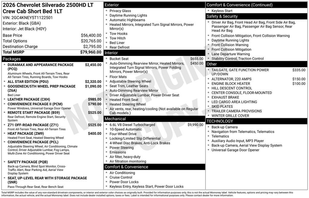 As an official Kelley Blue Book® Buying Center, weâll buy your vehicle even if you donât buy one from us! Get your Official Check out all these great options All Star Edition, Convenience Package (Dual-Zone Automatic Climate Control, Front LED Fog Lamps, and LED Cargo Area Lighting), Convenience Package II (Universal Home Remote), Gooseneck/5th Wheel Prep Package, Heat Package (Heated Steering Wheel), Leather Package, Preferred Equipment Group 1LT (120-Volt Bed Mounted Power Outlet, 120-Volt Interior Power Outlet, 17 Machined Aluminum Wheels, 170 Amp Alternator, 2-Speed Electronic Shift Transfer Case, 4-