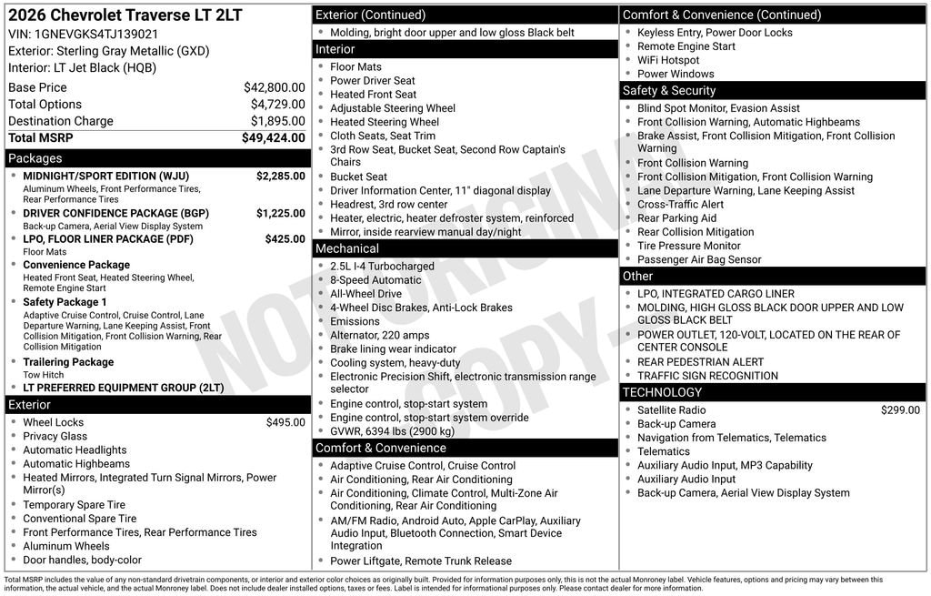As an official Kelley Blue Book® Buying Center, weâll buy your vehicle even if you donât buy one from us! Get your Official Check out all these great options Driver Confidence Package (HD Surround Vision, Key Card, Power Outlet, Rear Camera Mirror, Rear Pedestrian Alert, and Traffic Sign Recognition), Floor Liner Package (LPO) (1st & 2nd Row All-Weather Floor Liners (LPO), 3rd Row All-Weather Floor Liner (LPO), and Integrated Cargo Liner (LPO)), Midnight/Sport Edition (High Gloss Black Door Upper Molding and Wheels: 20 High Gloss Black Painted Aluminum), Preferred Equipment Group 2LT, AWD, 3 Years SiriusXM, 3rd row seats: split-bench, 4-Way Manual Front Passenger Seat Adjuster, 4-Wheel Disc Brakes, 6 Speakers, 6-Speaker Audio System Feature, 8-Way Power Driver Seat Adjuster, ABS brakes, Air Conditioning, Alloy wheels, AM/FM radio: SiriusXM with 360L, Apple CarPlay/Android Auto, Auto High-beam Headlights, Automatic temperature control, Black Lug Nut & Wheel Lock Kit (LPO), Brake assist, Bumpers: body-color, Child-Seat-Sensing Airbag, Compass, Delay-off headlights, Driver door bin, Driver vanity mirror, Dual front impact airbags, Dual front side impact