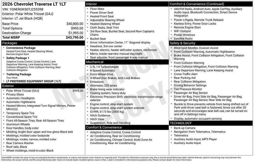 As an official Kelley Blue Book® Buying Center, weâll buy your vehicle even if you donât buy one from us! Get your Official Check out all these great options Preferred Equipment Group 1LT, 3rd row seats: split-bench, 4-Way Manual Front Passenger Seat Adjuster, 4-Wheel Disc Brakes, 6 Speakers, 6-Speaker Audio System Feature, 8-Way Power Driver Seat Adjuster, ABS brakes, Air Conditioning, Alloy wheels, AM/FM radio: SiriusXM with 360L, Apple CarPlay/Android Auto, Auto High-beam Headlights, Automatic temperature control, Brake assist, Bumpers: body-color, Child-Seat-Sensing Airbag, Compass, Delay-off headlights, Driver door bin, Driver vanity mirror, Dual front impact airbags, Dual front side impact airbags, Electronic Stability Control, Emergency communication system: OnStar, Four wheel independent suspension, Front anti-roll bar, Front Bucket Seats, Front Center Armrest, Front dual zone A/C, Front reading lights, Fully automatic headlights, Heated door mirrors, Heated Driver and Front Passenger Seats, Heated front seats, Heated steering wheel, Illuminated entry, Low tire pressure warning, Navigation System, Occupant sensing airbag, Outside temperature display, Overhead airbag, Overhead console, Panic alarm, Passenger door bin, Passenger vanity mirror, Power door mirrors, Power driver seat, Power Liftgate, Power steering, Power windows, Premium Cloth Seat Trim, Radio data system, Radio: : Audio System w/17.7 Diagonal Display, Rear air conditioning, Rear anti-roll bar, Rear reading lights, Rear window defroster, Rear window wiper, Remote keyless entry, Security system, SiriusXM with 360L Trial Subscription, Speed control, Speed-sensing steering, Spoiler, Steering wheel moun