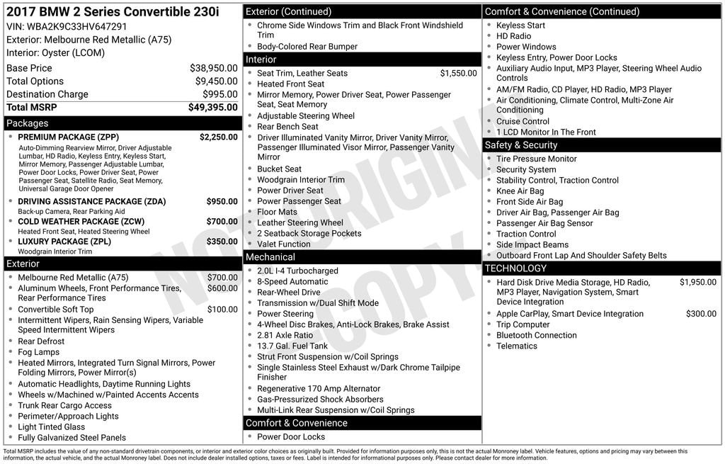 Check out all these great options Luxury Package (Fineline Stream Wood Trim and Luxury Line), 4-Wheel Disc Brakes, 6 Speakers, ABS brakes, Advanced Real-Time Traffic Information, Air Conditioning, Alloy wheels, AM/FM radio, Ambient Lighting, Anti-whiplash front head restraints, Apple CarPlay Compatibility, Auto-Dimming Interior & Driver Exterior Mirrors, Auto-Dimming Rear-View Mirror, Automatic temperature control, BMW Connected App Compatibility, BMW Online & BMW Apps, Brake assist, Bumpers: body-color, CD player, Comfort Access Keyless Entry, Convertible roof lining, Convertible roof wind blocker, Delay-off headlights, Driver door bin, Driver vanity mirror, Dual front impact airbags, Dual front side impact airbags, Electronic Stability Control, Emergency communication system: BMW Assist eCall, Four wheel independent suspension, Front anti-roll bar, Front Bucket Seats, Front Center Armrest, Front dual zone A/C, F