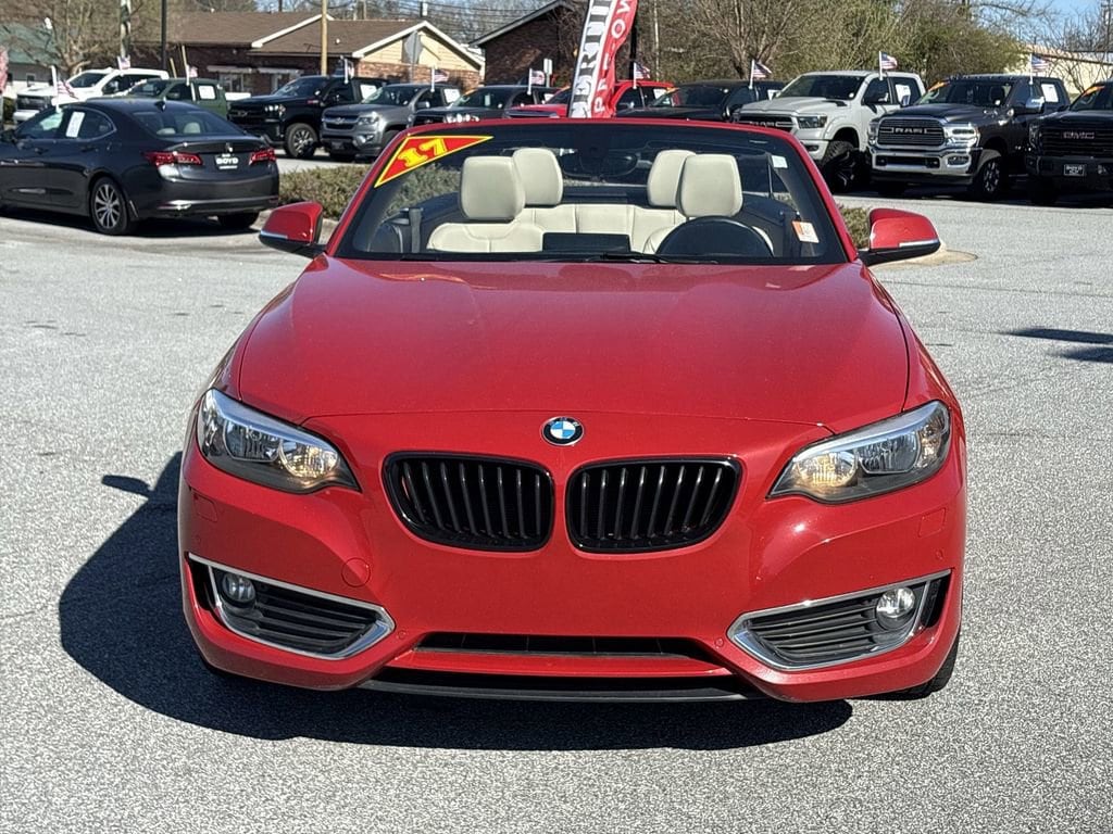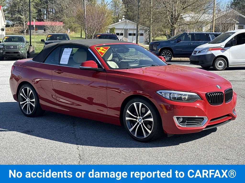 Boyd Chevrolet is proud to offer this Melbourne Red Metallic, 2017 2 Series 230i featuring: Luxury Package (Fineline Stream Wood Trim and Luxury Line), 4-Wheel Disc Brakes, 6 Speakers, ABS brakes, Advanced Real-Time Traffic Information, Air Conditioning, Alloy wheels, AM/FM radio, Ambient Lighting, Anti-whiplash front head restraints, Apple CarPlay Compatibility, Auto-Dimming Interior & Driver Exterior Mirrors, Auto-Dimming Rear-View Mirror, Automatic temperature control, BMW Connected App Compatibility, BMW Online & BMW Apps, Brake assist, Bumpers: body-color, CD player, Comfort Access Keyless Entry, Convertible roof lining, Convertible roof wind blocker, Delay-off headlights, Driver door bin, Driver vanity mirror, Dual front impact airbags, Dual front side impact airbags, Electronic Stability Control, Emergency communication system: BMW Assist eCall, Four wheel independent suspension, Front anti-roll bar, Front Bucket Seats, Front Center Armrest, Front dual zone A/C, Front fog lights, Front reading lights, Front Sport Seats, Fully automatic headlights, Glass rear window, Hands-Free Bluetooth & USB Audio Connection, Heated door mirrors, Heated Front Seats, Heated Steering Wheel, Hi-Fi Sound System, Illuminated entry, Increased Top Speed Limiter, Instrument Cluster w/Extended Contents, Integrated roll-over protection, Knee airbag, Leather Shift Knob, Leather steering wheel, Low tire pressure warning, Lumbar Support, Moonlight Black SoftTop, Navigation System, Occupant sensing airbag, Outside temperature display, Panic alarm, Park Distance Control, Passenger door bin, Passenger vanity mirror, Power convertible roof, Power door mirrors, Power driver seat, Power Front Seats, Power passenger seat, Power steering, Power windows, Radio data system, Radio: AM/FM/HD Stereo CD/MP3 Player, Rain sensing wipers, Rear anti-roll bar, Rear window defroster, Rear-View Camera, Remote keyless entry, Remote Services, Retractable Headlight Washers, Security system, SensaTec Upholstery, SiriusXM Satellite Radio, Speed control, Speed-sensing steering, Speed-Sensitive Wipers, Sport steering wheel, Steering wheel mounted audio controls, Tachometer, Telescoping steering wheel, Tilt steering wheel, Traction control, Trip computer, Turn signal indicator mirrors, Universal Garage-Door Opener, Variably intermittent wipers, Wheels: 17 x 7.5 Light Alloy (Style 379), and Wheels: 18 x 7.5 Fr & 18 x 8.0 Rr (Style 384)