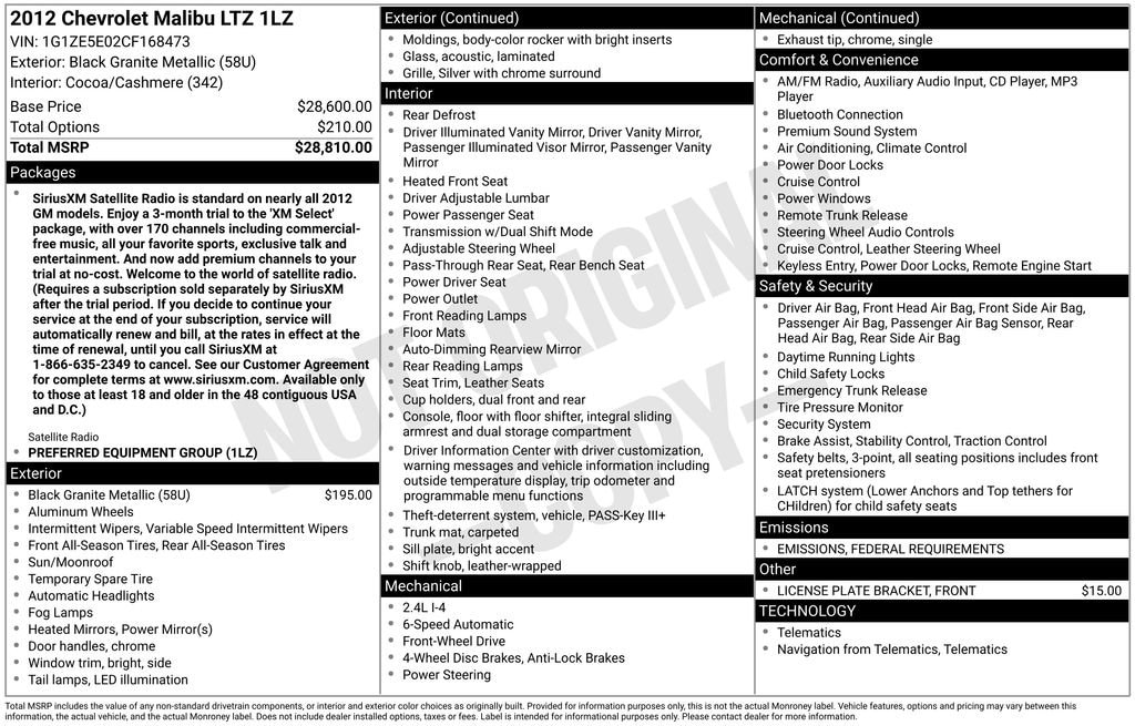 The Chevrolet Malibu is a thoughtfully engineered mid-size car that offers impressive safety & efficiency. Boyd is proud to offer this Black Granite Metallic, 2012 Malibu LTZ featuring: Cocoa/Cashmere Leather.