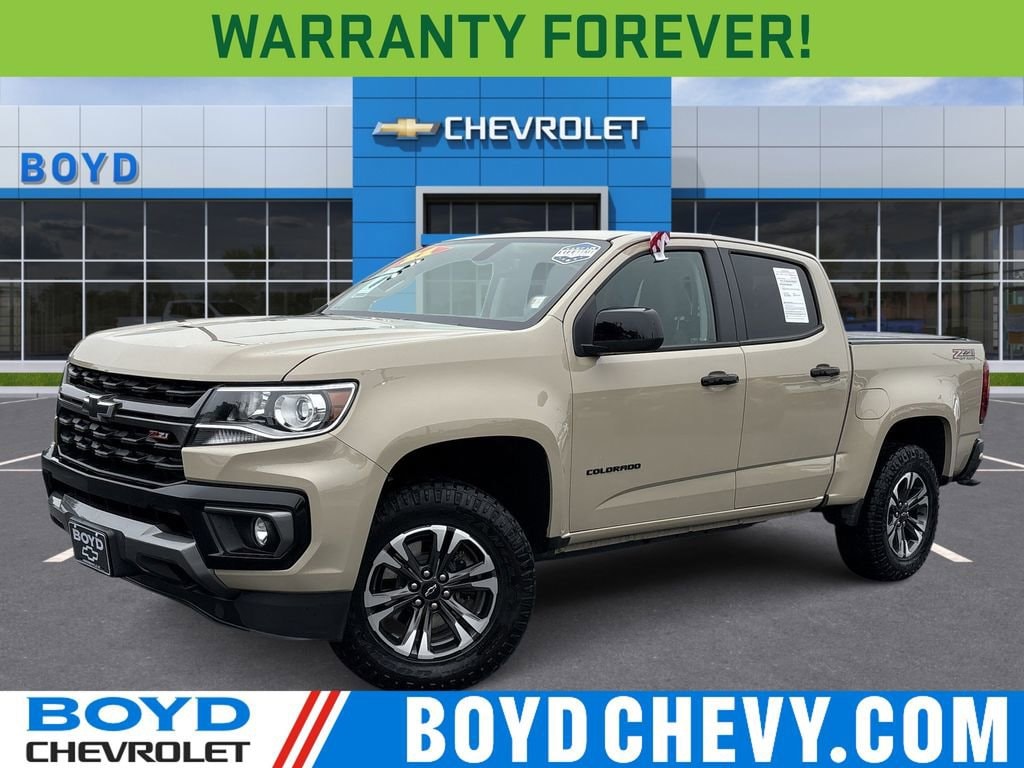 This 2022 Colorado Z71 at Boyd Chevrolet comes with lifetime powertrain coverage at no additional cost. Warranty Forever covers the engine, transmission and drive axel for the life of the vehicle with no limit on time or miles. Warranty Forever is exclusively at Boyd so come see us today! Boyd Chevy is proud to offer this Sand Dune Metallic, 2022 Colorado Z71 featuring: Check out all these great options Heavy-Duty Trailering Package, Performance Skid Plate Package (LPO), Preferred Equipment Group 4Z7 (Hitch Guidance, Tow/Haul Mode, and Ultrasonic Rear Park Assist), Colorado Z71, 4WD, 3.42 Rear Axle Ratio, 4-Wheel Disc Brakes, 6 Speakers, 6-Speaker Audio System Feature, ABS brakes, Air Conditioning, Alloy wheels, AM/FM radio: SiriusXM, Apple CarPlay/Android Auto, Auto-dimming Rear-View mirror, Automatic temperature control, Black Colorado Emblems (LPO), Black Spray-On Bedliner w/Chevrolet Logo, Black Tailgate CHEVROLET Lettering (LPO), Bumpers: body-color, Cloth/Leatherette Seat Trim, Compass, Delay-off headlights, Driver 6-Way Power Seat Adjuster, Driver door bin, Driver vanity mirror, Dual front impact airbags, Dual front side impact airbags, Electronic Stability Control, Exterior Parking Camera Rear, Front 1 Leveling Kit (LPO), Front anti-roll bar, Front Bucket Seats, Front Center Armrest, Front fog lights, Front License Plate Kit, Front reading lights, Front wheel independent suspension, Fully automatic headlights, HD Radio, Heated door mirrors, Heated steering wheel, Illuminated entry, Integrated Trailer Brake Controller, Low tire pressure warning, Occupant sensing airbag, Outside temperature display, Overhead airbag, Overhead console, Panic alarm, Passenger door bin, Passenger vanity mirror, Power door mirrors, Power Driver Lumbar Control Seat Adjuster, Power driver seat, Power steering, Power windows, Premium audio system: Chevrolet Infotainment 3 Plus, Radio data system, Radio: Chevrolet Infotainment 3 Plus System, Rear reading lights, Rear seat center armrest, Rear step bumper, Rear window defroster, Remote keyless entry, Security system, SiriusXM Radio, Speed control, Speed-sensing steering, Steering wheel mounted audio controls, Tachometer, Telescoping steering wheel, Tilt steering wheel, Traction control, Trip computer, Variably intermittent wipers, Wheels: 17 x 8 Bright Machined Aluminum, and Wireless Charging for Compatible Cell Phones. Colorado Z71, 4WD, Heavy-Duty Trailering Package, Hitch Guidance, Performance Skid Plate Package (LPO), Preferred Equipment Group 4Z7, Tow/Haul Mode, Ultrasonic Rear Park Assist.