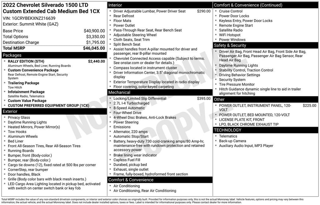 Check out all these great options Custom Convenience Package (Electric Rear-Window Defogger, EZ Lift Power Lock & Release Tailgate, LED Cargo Area Lighting, Remote Vehicle Starter System, and Theft Deterrent System (Unauthorized Entry)), Custom Value Package, Infotainment Package (Chevrolet Connected Access Capable, OnStar & Chevrolet Connected Services Capable, SiriusXM Radio, and Wi-Fi Hot Spot Capable), Preferred Equipment Group 1CX (3.5 Monochromatic Display Driver Info Center, Bluetooth® For Phone, Body Color Grille, Color-Keyed Carpeting Floor Covering, Compass, Deep-Tinted Glass, Electronic Cruise Control, Front Frame-Mounted Black Recovery Hooks, Front Rubberized Vinyl Floor Mats, Manual Tilt Wheel Steering Column, Power Door Locks, Power Front Windows w/Driver Express Up/Down, Power Front Windows w/Passenger Express Down, Power Rear Windows w/Express Down, Rear 60/40 Folding Bench Seat (Folds Up), Rear Rubberized-Vinyl Floor Mats, Remote Keyless Entry, and Standard Tailgate), Rally Edition (4 Black Round Assist Steps (LPO), Black Chrome Exhaust Tip (LPO), Chevytec Spray-On Black Bedliner, and Wheels: 20 x 9 High Gloss Black Painted Alum)