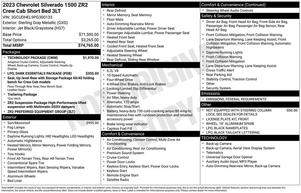 This 2023 Silverado 1500 ZR2 at Boyd Chevrolet comes with lifetime powertrain coverage at no additional cost. Warranty Forever covers the engine, transmission and drive axel for the life of the vehicle with no limit on time or miles. Warranty Forever is exclusively at Boyd so come see us today! Boyd Chevy is proud to offer this Sterling Gray Metallic, 2023 Silverado 1500 ZR2 featuring: Check out all these great options Dark Essentials Package (LPO) (Black Name Plates (LPO) and Black Tailgate CHEVROLET Lettering (LPO)), Preferred Equipment Group 3LT (10-Way Power Driver Seat w/Lumbar, 10-Way Power Passenger Seat Adjuster w/Lumbar, 12.3 Multicolor Reconfigurable Digital Display, 120-Volt Bed Mounted Power Outlet, 120-Volt Instrument Panel Power Outlet, 170 Amp Alternator, 2 USB Data Ports, 2nd Row Heated Outboard Seats, All-Weather Floor Liner (LPO), Auto-Dimming Inside Rear-View Mirror, Auto-Locking Rear Differential, Bed View Camera, Bluetooth® For Phone, Chevrolet Connected Access Capable, Chevytec Spray-On Black Bedliner, Color-Keyed Carpeting Floor Covering, Compass, Deep-Tinted Glass, Driver Memory, Dual Exhaust, Dual Rear USB Ports (Charge Only), Electric Rear-Window Defogger, Electrical Steering Column Lock, Electronic Cruise Control, EZ Lift Power Lock & Release Tailgate, Floor Mounted Center Console, Front LED Fog Lamps, Front Rainsensing Wipers, HD Surround Vision, Heated Driver & Front Outboard Passenger Seats, Heated Steering Wheel, Heavy-Duty Air Filter, High Gloss Black Mirror Caps, Hill Descent Control, Hitch Guidance w/Hitch View, Integrated Trailer Brake Controller, Keyless Open & Start, LED Cargo Area Lighting, Manual Tilt/Telescoping Steering Column, OnStar & Chevrolet Connected Services Capable, Outside Heated Power-Adjustable Mirrors, Performance Red Recovery Hooks, Perimeter Lighting, Power Front Passenger Windows w/Express Up/Down, Power Front Windows w/Driver Express Up/Down, Power Rear Windows w/Express Down, Power Sliding Rear Window w/Rear Defogger, Rear Cross Traffic Alert-Braking, Rear Park Assist, Rear Pedestrian Alert, Rear Wheelhouse Liners, Remote Vehicle Starter System, Safety Alert Seat, SiriusXM w/360L, Standard Tailgate, Steering Wheel Audio Controls, Theft Deterrent System (Unauthorized Entry), Trailer Camera Provisions, Trailer Side Blind Zone Alert, Trailering App, Universal Home Remote, Ventilated Driver & Front Passenger Seats, Wi-Fi Hot Spot Capable, Wireless Charging, Wireless Phone Projection, and Wrapped Steering Wheel), Technology Package (15 Diagonal Multicolor Head-Up Display, Adaptive Cruise Control, Power Tilt & Telescoping Steering Column, and Rear Camera Mirror), Trailering Package (Hitch Guidance), Up-Level Rear Seat w/Storage Package, ZR2 Suspension Package, 10-Speed Automatic, 4WD, Jet Black/Graystone Leather, 3.23 Rear Axle Ratio, 4-Wheel Disc Brakes, 7 Speakers, ABS brakes, Air Conditioning, Alloy wheels, AM/FM radio: SiriusXM with 360L, Apple CarPlay/Android Auto, Auto High-beam Headlights, Auto-dimming door mirrors, Auto-dimming Rear-View mirror, Automatic Emergency Braking, Automatic temperature control, Brake assist, Delay-off headlights, Driver door bin, Driver vanity mirror, Dual front impact airbags, Dual front side impact airbags, Electronic Stability Control, Electronic Transmission Range Selector Shifter, Following Distance Indicator, Forward Collision Alert, Front anti-roll bar, Front Bucket Seats, Front Center Armrest, Front dual zone A/C, Front fog lights, Front License Plate Kit, Front Pedestrian Braking, Front reading lights, Front wheel independent suspension, Fully automatic headlights, Garage door transmitter, Heated door mirrors, Heated front seats, Heated rear seats, Heated steering wheel, Illuminated entry, IntelliBeam Automatic High Beam On/Off, Lane Keep Assist w/Lane Departure Warning, Low tire pressure warning, Memory seat, Not Equipped w/Steering Column Lock, Occupant sensing airbag, Outside temp