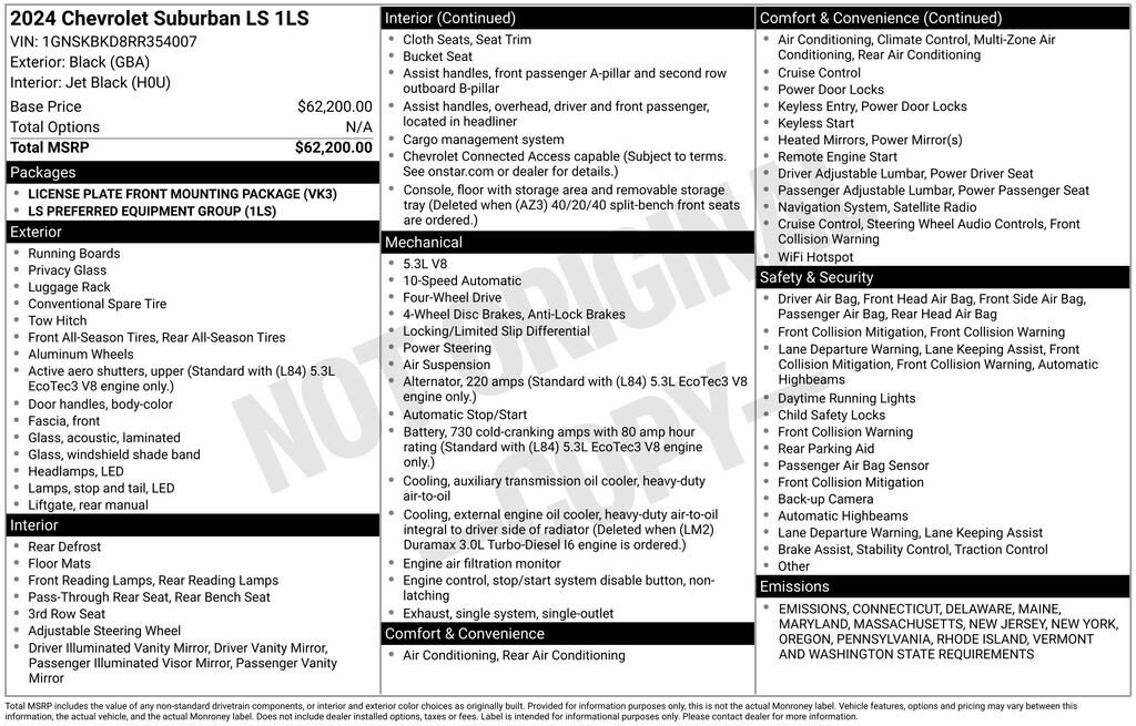 This 2024 Suburban LS at Boyd Chevrolet comes with lifetime powertrain coverage at no additional cost. Warranty Forever covers the engine, transmission and drive axel for the life of the vehicle with no limit on time or miles. Warranty Forever is exclusively at Boyd so come see us today! Boyd Chevy is proud to offer this Black, 2024 Suburban LS featuring: Check out all these great options License Plate Front Mounting Package, Preferred Equipment Group 1LS (1st & 2nd Row Color-Keyed Carpeted Floor Mats, Color-Keyed Carpeting Floor Covering, Driver & Front Outboard Passenger Airbags, Floor Console w/Storage Area, LED Daytime Running Lamps, Remote Start, SiriusXM w/360L, and Wrapped Steering Wheel), 3.23 Rear Axle Ratio, 3rd row seats: split-bench, 4-Wheel Disc Brakes, 6 Speakers, ABS brakes, Air Conditioning, Alloy wheels, AM/FM radio: SiriusXM with 360L, Apple CarPlay/Android Auto, Auto High-beam Headlights, Automatic temperature control, Brake assist, Bumpers: body-color, Compass, Delay-off headlights, Driver door bin, Driver vanity mirror, Dual front impact airbags, Dual front side impact airbags, Electronic Stability Control, Emergency communication system: OnStar and Chevrolet connected services capable, Four wheel independent suspension, Front anti-roll bar, Front Bucket Seats, Front Center Armrest, Front dual zone A/C, Front reading lights, Fully automatic headlights, Heated door mirrors, Illuminated entry, Low tire pressure warning, Occupant sensing airbag, Outside temperature display, Overhead airbag, Overhead console, Panic alarm, Passenger door bin, Passenger vanity mirror, Power door mirrors, Power driver seat, Power passenger seat, Power steering, Power windows, Premium audio system: Chevrolet Infotainment 3, Premium Cloth Seat Trim, Premium Smooth Ride Suspension, Radio: Chevrolet Infotainment 3 System, Rain sensing wipers, Rear air conditioning, Rear anti-roll bar, Rear reading lights, Rear seat center armrest, Rear window defroster, Rear window wiper, Remote keyless entry, Roof rack: xxxxxx, Security system, Speed control, Speed-sensing steering, Split folding rear seat, Spoiler, Steering wheel mounted audio controls, Tachometer, Telescoping steering wheel, Tilt steering wheel, Traction control, Trip computer, Variably intermittent wipers, Voltmeter, and Wheels: 18 x 8.5 Bright Silver Painted Aluminum.