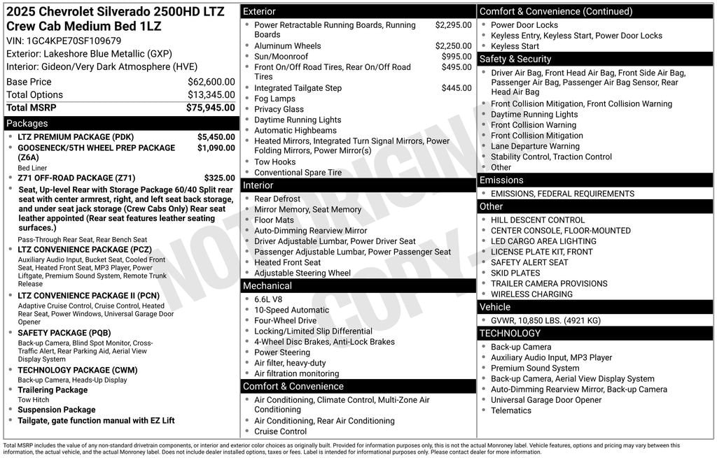 This 2025 Silverado 2500HD LTZ at Boyd Chevrolet comes with lifetime powertrain coverage at no additional cost. Warranty Forever covers the engine, transmission and drive axel for the life of the vehicle with no limit on time or miles. Warranty Forever is exclusively at Boyd so come see us today! Boyd Chevy is proud to offer this Lakeshore Blue Metallic, 2025 Silverado 2500HD LTZ featuring: Check out all these great options Gooseneck/5th Wheel Prep Package (Black Chevytec Spray-On Bedliner), LTZ Convenience Package (2 Charge/Data USB Ports Inside Center Console, BOSE Premium 7-Speaker Sound System, Floor-Mounted Center Console, Front Bucket Seats, LED Cargo Area Lighting, Ventilated Driver & Front Passenger Seats, and Wireless Charging), LTZ Convenience Package II (Adaptive Cruise Control, Heated 2nd Row Outboard Seats, Power Sliding Rear Window w/Defogger, and Universal Home Remote), LTZ Premium Package, Preferred Equipment Group 1LZ (120-Volt Bed Mounted Power Outlet, 120-Volt Interior Power Outlet, 170 Amp Alternator, 6-Speaker Audio System, Auto-Dimming Inside Rear-View Mirror, Bluetooth® For Phone, Chevrolet Connected Access Capable, Chrome Door Handles, Chrome Mirror Caps, Color-Keyed Carpeting Floor Covering, Compass, Deep-Tinted Glass, Electric Rear-Window Defogger, Electronic Cruise Control w/Set & Resume Speed, EZ Lift Power Lock & Release Tailgate, Front LED Fog Lamps, Front Rain-Sensing Wipers, Front Rubberized Vinyl Floor Mats, HD Rear Vision Camera, Heated Steering Wheel, Hitch Guidance w/Hitch View, In-Vehicle Trailering App System, Keyless Open & Start, Manual Tilt & Telescoping Steering Column, OnStar Services Capable, Power Door Locks, Power Front Windows w/Driver Express Up/Down, Power Front Windows w/Passenger Express Up/Down, Power Rear Windows w/Express Down, Push Button Start, Rear Rubberized Vinyl Floor Mats, Rear Wheelhouse Liners, Remote Vehicle Starter System, SiriusXM w/360L Trial Subscription, Standard Tailgate, Steering Wheel Audio Controls, Unauthorized Entry Theft-Deterrent System, Wi-Fi Hotspot Capable, Wireless Phone Projection, and Wrapped Steering Wheel), Safety Package (Bed View Camera w/2 Trailer Camera Provisions, HD Surround Vision, Rear Cross Traffic Alert, Safety Alert Seat, Trailer Camera Provisions, Trailer Side Blind Zone Alert, and Ultrasonic Front & Rear Park Assist), Suspension Package, Technology Package (15 Diagonal Multicolor Head-Up Display and Rear Camera Mirror), Up-Level Rear Seat w/Storage Package, Z71 Off-Road Package (Hill Descent Control and Off-Road Suspension), 10-Speed Automatic, 4WD, Gideon/Very Dark Atmosphere Leather, 10-Way Power Driver Seat Adjuster w/Lumbar, 10-Way Power Passenger Seat Adjuster w/Lumbar, 3.73 Rear Axle Ratio, 4-Wheel Disc Brakes, 6 Speakers, 720 Cold-Cranking Amps Heavy-Duty Battery, ABS brakes, Air Conditioning, Alloy wheels, AM/FM radio: SiriusXM with 360L, Apple CarPlay/Android Auto, Auto High-beam Headlights, Auto-dimming door mirrors, Auto-dimming Rear-View mirror, Automatic temperature control, Brake assist, Bumpers: chrome, Delay-off headlights, Driver door bin, Driver Memory, Driver vanity mirror, Dual front impact airbags, Dual front side impact airbags, Durabed Pickup Bed, Electronic Stability Control, Emergency communication system: OnStar, Front 40/20/40 Split-Bench Seats w/Lockable Storage, Front anti-roll bar, Front Center Armrest w/Storage, Front dual zone A/C, Front fog lights, Front License Plate Kit, Front reading lights, Front wheel independent suspension, Fully automatic headlights, Heated door mirrors, Heated Driver & Front Outboard Passenger Seating, Heated front seats, Heated steering wheel, Illuminated entry, Low tire pressure warning, Memory seat, Multi-Flex Tailgate, Occupant sensing airbag, Outside temperature display, Overhead airbag, Overhead console, Panic alarm, Passenger door bin, Passenger vanity mirror, Perf Leather-Appointed Front Outboard Seat Trim, Power doo