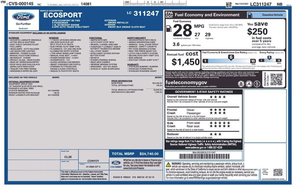 Boyd Chevrolet is proud to offer this Smoke Metallic, 2020 EcoSport SE featuring: Equipment Group 200A, Interior Protection Package (Cargo Mat and Front & Rear Floor Liners), 3.44 Axle Ratio, 4-Wheel Disc Brakes, 6 Speakers, ABS brakes, Air Conditioning, Alloy wheels, AM/FM radio: SiriusXM, AppLink/Apple CarPlay and Android Auto, Automatic temperature control, Brake assist, Bumpers: body-color, Compass, Delay-off headlights, Driver door bin, Driver vanity mirror, Dual front impact airbags, Dual front side impact airbags, Electronic Stability Control, Emergency communication system: SYNC 3 911 Assist, Exterior Parking Camera Rear, Front anti-roll bar, Front Bucket Seats, Front Center Armrest, Front fog lights, Front License Plate Bracket, Front reading lights, Front wheel independent suspension, Fully automatic headlights, Heated front seats, Illuminated entry, Knee airbag, Leather Shift Knob, Leather steering wheel, Low tire pressure warning, Occupant sensing airbag, Outside temperature display, Overhead airbag, Overhead console, Panic alarm, Passenger door bin, Passenger vanity mirror, Power door mirrors, Power driver seat, Power moonroof, Power steering, Power windows, Radio data system, Radio: AM/FM Stereo w/MP3 Capable, Rear Parking Sensors, Rear seat center armrest, Rear side impact airbag, Rear window defroster, Rear window wiper, Remote keyless entry, Roof rack: rails only, SiriusXM Radio, Speed control, Speed-sensing steering, Split folding rear seat, Steering wheel mounted audio controls, SYNC 3 Communications & Entertainment System, Tachometer, Telescoping steering wheel, Tilt steering wheel, Tire Inflator & Sealant Kit, Traction control, Trip computer, Turn signal indicator mirrors, Unique Cloth Heated Front Bucket Seats, Variably intermittent wipers, and Wheels: 16 Shadow Silver-Painted Aluminum.