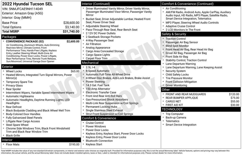 This 2022 Tucson SEL at Boyd Chevrolet comes with lifetime powertrain coverage at no additional cost. Warranty Forever covers the engine, transmission and drive axel for the life of the vehicle with no limit on time or miles. Warranty Forever is exclusively at Boyd so come see us today! Boyd Chevy is proud to offer this Amazon Gray, 2022 Tucson SEL featuring: Check out all these great options Convenience Package (10.25 Digital Instrument Cluster, Auto-Dimming Interior Mirror w/Homelink, Digital Key, Dual Automatic Temperature Control, Hands-Free Power Liftgate w/Auto-Open, Leather-Wrapped Shift Knob, Leather-Wrapped Steering Wheel, LED Interior Lights (Room, Map), Option Group 02, Power Sunroof, Ultrasonic Rear Occupant Alert, Wheels: 19 x 7.5J Machine-Face Finish Alloy, and Wireless Phone Charging), AWD, 3.648 Axle Ratio, 4-Wheel Disc Brakes, 6 Speakers, ABS brakes, Air Conditioning, Alloy wheels, AM/FM radio: SiriusXM, Apple CarPlay & Android Auto, Auto High-beam Headlights, Brake assist, Bumpers: body-color, Cargo Net, Carpeted Floor Mats, Delay-off headlights, Driver door bin, Driver vanity mirror, Dual front impact airbags, Dual front side impact airbags, Electronic Stability Control, Emergency communication system: Blue Link Connected Car Service (3-year complimentary subscription), First Aid Kit, Four wheel independent suspension, Front and Rear Mudguards, Front anti-roll bar, Front Bucket Seats, Front Center Armrest, Front reading lights, Fully automatic headlights, Heated door mirrors, Heated Front Bucket Seats, Heated front seats, Illuminated entry, Low tire pressure warning, Occupant sensing airbag, Outside temperature display, Overhead airbag, Overhead console, Panic alarm, Passenger door bin, Passenger vanity mirror, Power door mirrors, Power driver seat, Power steering, Power windows, Radio data system, Radio: AM/FM/HD/SiriusXM Audio System, Rear anti-roll bar, Rear Bumper Applique, Rear seat center armrest, Rear window defroster, Rear window wiper, Remote keyless entry, Roof rack: rails only, Security system, Speed control, Split folding rear seat, Spoiler, Stain & Odor Resistant Cloth Seat Trim, Steering wheel mounted audio controls, Tachometer, Telescoping steering wheel, Tilt steering wheel, Traction control, Trip computer, Turn signal indicator mirrors, Variably intermittent wipers, Wheel Locks, and Wheels: 17 x 7.0J Alloy. AWD.