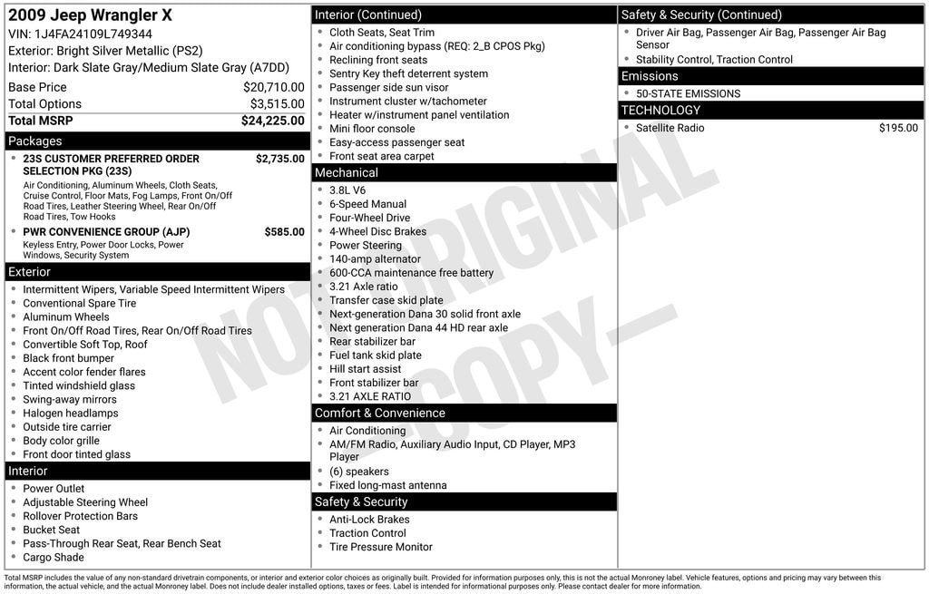 Born from the U.S. Militaryâs need for a tough, go-anywhere vehicle, Jeep has spent decades building some of the most capable models on the road. Boyd is proud to offer this Bright Silver Metallic Clearcoat, 2009 Wrangler X, featuring: Wrangler X, 2D Sport Utility, 6-Speed Manual, 4WD, Bright Silver Metallic Clearcoat, Gray Cloth, 17 x 7.5 Aluminum Wheels, Air Conditioning, Cloth Bucket Seats, Fog Lamps, Front Floor Mats, Full Length Floor Console, Leather Wrapped Steering Wheel, Power Convenience Group, Power Locks, Power Windows w/Driver & Front Passenger 1-Touch, Quick Order Package 23S, Remote Keyless Entry, Security Alarm, Speed Control, Temperature & Compass Gauge, Tow Hooks (2 front/1 rear).Odometer is 8026 miles below market average!15/19 City/Highway MPGAwards:* 2009 KBB.com Best Resale Value AwardsReviews:* Whether youâre an off-road enthusiast, an occasional camper or just a city slicker with a back-country mindset, the rugged yet refined 2009 Jeep Wrangler is sure to please. Source: KBB.comCheck out all these great options Power Convenience Group (Power Locks, Power Windows w/Driver & Front Passenger 1-Touch, Remote Keyless Entry, and Security Alarm), Quick Order Package 23S (17 x 7.5 Aluminum Wheels, Air Conditioning, Cloth Bucket Seats, Fog Lamps, Front Floor Mats, Full Length Floor Console, Leather Wrapped Steering Wheel, Speed Control, Temperature & Compass Gauge, Tow Hooks (2 front/1 rear), and Driver Height Adjuster Seat), Wrangler X, 2D Sport Utility, 6-Speed Manual, 4WD, Bright Silver Metallic Clearcoat, Gray Cloth, 16 x 7.0 Luxury Styled Steel Wheels, 3.21 Axle Ratio, 4-Wheel Disc Brakes, 6 Speakers, ABS brakes, AM/FM CD/MP3 Radio, AM/FM radio, Brake assist, CD player, Driver door bin, Dual front impact airbags, Easy Folding SoftTop, Electronic Stability Control, Front anti-roll bar, Front Bucket Seats, Integrated roll-over protection, Low tire pressure warning, Normal Duty Suspension, Occupant sensing airbag, Passenger door bin, Power steering, Rear anti-roll bar, SIRIUS Satellite Radio, Tachometer, Tilt steering wheel, Traction control, Trip computer, Variably intermittent wipers, and Vinyl Bucket Seats Located at 1875 Spartanburg Hwy, Hendersonville, NC, Boyd Chevrolet has proudly served Western North Carolina and Upstate South Carolina since 1932. Weâre committed to our communities including Asheville, Fletcher, Hendersonville, Hickory, Spartanburg, Gastonia, Boone, Charlotte, Johnson City, and Knoxville, as well as the broader regions of North Carolina, South Carolina, Virginia, and Tennessee.As an official Kelley Blue Book® Buying Center, weâll buy your vehicle even if you donât buy one from us! Get your Official Check out all these great options Power Convenience Group (Power Locks, Power Windows w/Driver & Front Passenger 1-Touch, Remote Keyless Entry, and Security Alarm), Quick Order Package 23S (17 x 7.5 Aluminum Wheels, Air Conditioning, Cloth Bucket Seats, Fog Lamps, Front Floor Mats, Full Length Floor Console, Leather Wrapped Steering Wheel, Speed Control, Temperature & Compass Gauge, Tow Hooks (2 front/1 rear), and Driver Height Adjuster Seat), Wrangler X, 2D Sport Utility, 6-Speed Manual, 4WD, Bright Silver Metallic Clearcoat, Gray Cloth, 16 x 7.0 Luxury Styled Steel Wheels, 3.21 Axle Ratio, 4-Wheel Disc Brakes, 6 Speakers, ABS brakes, AM/FM CD/MP3 Radio, AM/FM radio, Brake assist, CD player, Driver door bin, Dual front impact airbags, Easy Folding SoftTop, Electronic Stability Control, Front anti-roll bar, Front Bucket Seats, Integrated roll-over protection, Low tire pressure warning, Normal Duty Suspension, Occupant sensing airbag, Passenger door bin, Power steering, Rear anti-roll bar, SIRIUS Satellite Radio, Tachometer, Tilt steering wheel, Traction control, Trip computer, Variably intermittent wipers, and Vinyl Bucket Seats Instant Cash Offer today at BoydChevy.com.Call (828) 693-3461 for availability or to sch