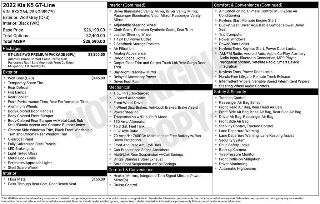 This 2022 K5 GT-Line at Boyd Chevrolet comes with lifetime powertrain coverage at no additional cost. Warranty Forever covers the engine, transmission and drive axel for the life of the vehicle with no limit on time or miles. Warranty Forever is exclusively at Boyd so come see us today! Boyd Chevy is proud to offer this Wolf Gray, 2022 K5 GT-Line featuring: Check out all these great options GT-Line FWD Premium Package (Forward Collision Avoidance-Assist - Cyclist, Forward Collision Avoidance-Assist - Junction Turn, Gloss Black Pillar & Door Frame Cover, and Highway Driving Assist), 4-Wheel Disc Brakes, 6 Speakers, ABS brakes, Air Conditioning, Alloy wheels, AM/FM radio: SiriusXM, Apple CarPlay & Android Auto, Auto High-beam Headlights, Automatic temperature control, Brake assist, Bumpers: body-color, Carpeted Floor Mats, Cloth/Leatherette Seat Trim, Delay-off headlights, Driver door bin, Driver vanity mirror, Dual front impact airbags, Dual front side impact airbags, Electronic Stability Control, Four wheel independent suspension, Front anti-roll bar, Front Bucket Seats, Front Center Armrest, Front dual zone A/C, Front fog lights, Front reading lights, Fully automatic headlights, Heated door mirrors, Illuminated entry, Knee airbag, Low tire pressure warning, Navigation System, Occupant sensing airbag, Outside temperature display, Overhead airbag, Overhead console, Panic alarm, Passenger door bin, Passenger vanity mirror, Power door mirrors, Power driver seat, Power steering, Power windows, Radio data system, Radio: AM/FM/MP3 Audio System, Rear anti-roll bar, Rear seat center armrest, Rear side impact airbag, Rear window defroster, Remote keyless entry, Security system, Speed control, Speed-sensing steering, Split folding rear seat, Spoiler, Sport steering wheel, Steering wheel mounted audio controls, Tachometer, Telescoping steering wheel, Tilt steering wheel, Traction control, Trip computer, Turn signal indicator mirrors, Variably intermittent wipers, and Wheels: 7.5J x 18 Gloss Black Machined Finish Alloy.