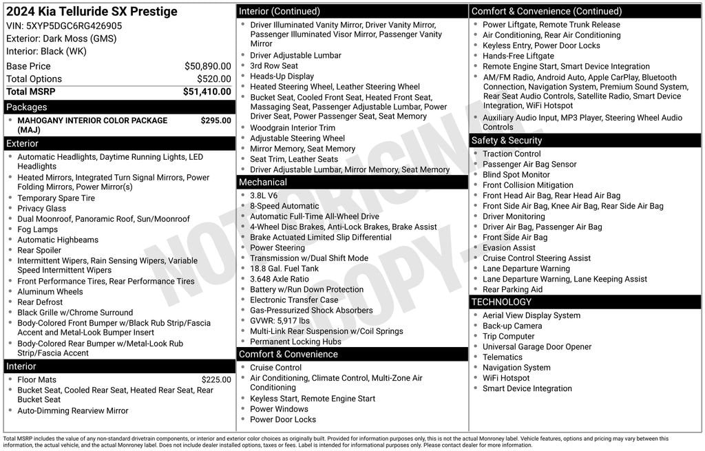 This 2024 Telluride SX-Prestige at Boyd Chevrolet comes with lifetime powertrain coverage at no additional cost. Warranty Forever covers the engine, transmission and drive axel for the life of the vehicle with no limit on time or miles. Warranty Forever is exclusively at Boyd so come see us today! Boyd Chevy is proud to offer this Dark Moss, 2024 Telluride SX-Prestige featuring: Check out all these great options Mahogany Interior Color Package, ABS brakes, Active Cruise Control, Alloy wheels, Compass, Electronic Stability Control, Front dual zone A/C, Heated & Ventilated Front Bucket Seats, Heated door mirrors, Heated front seats, Heated rear seats, Illuminated entry, Low tire pressure warning, Navigation System, Power Liftgate, Power moonroof, Remote keyless entry, Traction control, 10 Speakers, 3.648 Axle Ratio, 3rd row seats: split-bench, 4-Wheel Disc Brakes, Air Conditioning, AM/FM radio: SiriusXM, Apple CarPlay & Android Auto, Auto High-beam Headlights, Auto-dimming Rear-View mirror, Automatic temperature control, Brake assist, Bumpers: body-color, Delay-off headlights, Driver door bin, Driver vanity mirror, Dual front impact airbags, Dual front side impact airbags, Emergency communication system: 911 Connect, Exterior Parking Camera Rear, Four wheel independent suspension, Front anti-roll bar, Front Bucket Seats, Front Center Armrest, Front fog lights, Front reading lights, Fully automatic headlights, Garage door transmitter: HomeLink, harman/kardon® Speakers, Heads-Up Display, Heated steering wheel, Knee airbag, Leather Shift Knob, Leather steering wheel, Memory seat, Occupant sensing airbag, Outside temperature display, Overhead airbag, Overhead console, Panic alarm, Passenger door bin, Passenger vanity mirror, Power door mirrors, Power driver seat, Power passenger seat, Power steering, Power windows, Premium Nappa Leather Seat Trim, Radio data system, Radio: AM/FM Harman Kardon Audio System, Rain sensing wipers, Rear air conditioning, Rear anti-roll bar, Rear audio controls, Rear reading lights, Rear side impact airbag, Rear window defroster, Rear window wiper, Reclining 3rd row seat, Roof rack: rails only, Security system, Smart Key w/ Push Button and Remote Start, Speed control, Speed-sensing steering, Split folding rear seat, Spoiler, Steering wheel mounted audio controls, Tachometer, Telescoping steering wheel, Tilt steering wheel, Trip computer, Turn signal indicator mirrors, Variably intermittent wipers, Ventilated front seats, Ventilated rear seats, and Wheels: 20 x 7.5 Black Finish. ABS brakes, Active Cruise Control, Alloy wheels, Compass, Electronic Stability Control, Front dual zone A/C, Heated & Ventilated Front Bucket Seats, Heated door mirrors, Heated front seats, Heated rear seats, Illuminated entry, Low tire pressure warning, Mahogany Interior Color Package, Navigation System, Power Liftgate, Power moonroof, Remote keyless entry, Traction control.