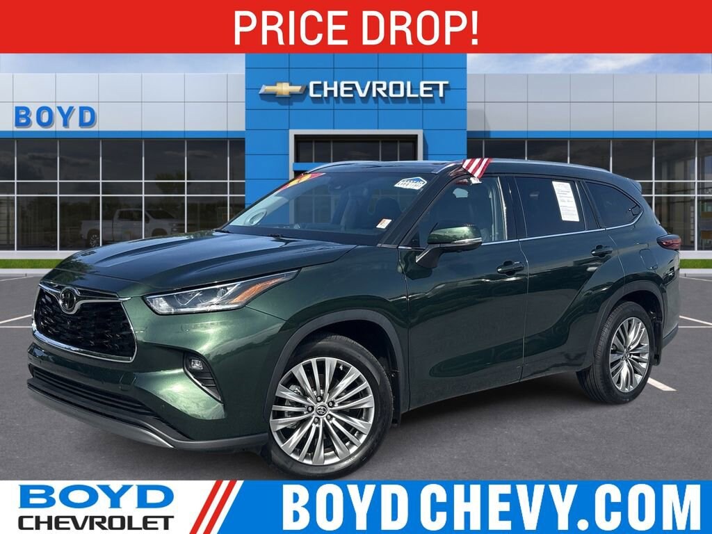 This 2023 Highlander Platinum at Boyd Chevrolet comes with lifetime powertrain coverage at no additional cost. Warranty Forever covers the engine, transmission and drive axel for the life of the vehicle with no limit on time or miles. Warranty Forever is exclusively at Boyd so come see us today! Boyd Chevy is proud to offer this Green, 2023 Highlander Platinum featuring: Check out all these great options Highlander Platinum, 4D Sport Utility, 2.4L I4 PDI Turbocharged DOHC 16V LEV3-SULEV30 265hp, 8-Speed Automatic, FWD, Green, Black Cloth, ABS brakes, Active Cruise Control, Alloy wheels, Electronic Stability Control, Front dual zone A/C, Heated door mirrors, Heated front seats, Heated rear seats, Heated/Ventilated Front Bucket Seats, Illuminated entry, Leather Seat Trim, Low tire pressure warning, Navigation System, Power Liftgate, Power moonroof, Remote keyless entry, Traction control, 11 Speakers, 20 Painted Alloy Wheels, 3.329 Axle Ratio, 3rd row seats: split-bench, 4-Wheel Disc Brakes, Air Conditioning, AM/FM radio: SiriusXM, Auto High-beam Headlights, Auto-dimming Rear-View mirror, Automatic temperature control, Brake assist, Bumpers: body-color, Delay-off headlights, Digital Rearview Mirror w/HomeLink, Driver door bin, Driver vanity mirror, Dual front impact airbags, Dual front side impact airbags, Emergency communication system: Safety Connect (up to 10-year trial subscription), Four wheel independent suspension, Front anti-roll bar, Front Bucket Seats, Front Center Armrest, Front fog lights, Front reading lights, Fully automatic headlights, Garage door transmitter: HomeLink, Heads-Up Display, Heated steering wheel, High Grade LED Projector Headlights, Knee airbag, Leather Shift Knob, Leather steering wheel, Memory seat, Navigation system: Drive Connect Cloud Navigation (1-year trial subscription), Occupant sensing airbag, Outside temperature display, Overhead airbag, Overhead console, Panic alarm, Panoramic Moonroof, Panoramic View Monitor, Passenger door bin, Passenger vanity mirror, Power door mirrors, Power driver seat, Power passenger seat, Power steering, Power windows, Radio: 12.3 Toyota Audio Multimedia w/JBL Premium, Rain sensing wipers, Rear air conditioning, Rear anti-roll bar, Rear reading lights, Rear window defroster, Rear window wiper, Reclining 3rd row seat, Roof rack: rails only, Security system, Speed control, Speed-sensing steering, Split folding rear seat, Spoiler, Steering wheel mounted audio controls, Tachometer, Telescoping steering wheel, Tilt steering wheel, Trip computer, Turn signal indicator mirrors, Variably intermittent wipers, and Ventilated front seats. Highlander Platinum, 4D Sport Utility, 2.4L I4 PDI Turbocharged DOHC 16V LEV3-SULEV30 265hp, 8-Speed Automatic, FWD, Green, Black Cloth, ABS brakes, Active Cruise Control, Alloy wheels, Electronic Stability Control, Front dual zone A/C, Heated door mirrors, Heated front seats, Heated rear seats, Heated/Ventilated Front Bucket Seats, Illuminated entry, Leather Seat Trim, Low tire pressure warning, Navigation System, Power Liftgate, Power moonroof, Remote keyless entry, Traction control.22/29 City/Highway MPG 22/29 City/Highway MPGCheck out all these great options Highlander Platinum, 4D Sport Utility, 2.4L I4 PDI Turbocharged DOHC 16V LEV3-SULEV30 265hp, 8-Speed Automatic, FWD, Green, Black Cloth, ABS brakes, Active Cruise Control, Alloy wheels, Electronic Stability Control, Front dual zone A/C, Heated door mirrors, Heated front seats, Heated rear seats, Heated/Ventilated Front Bucket Seats, Illuminated entry, Leather Seat Trim, Low tire pressure warning, Navigation System, Power Liftgate, Power moonroof, Remote keyless entry, Traction control, 11 Speakers, 20 Painted Alloy Wheels, 3.329 Axle Ratio, 3rd row seats: split-bench, 4-Wheel Disc Brakes, Air Conditioning, AM/FM radio: SiriusXM, Auto High-beam Headlights, Auto-dimming Rear-View mirror, Automatic temperature control, Brake assist, Bumpers: body-color, Delay